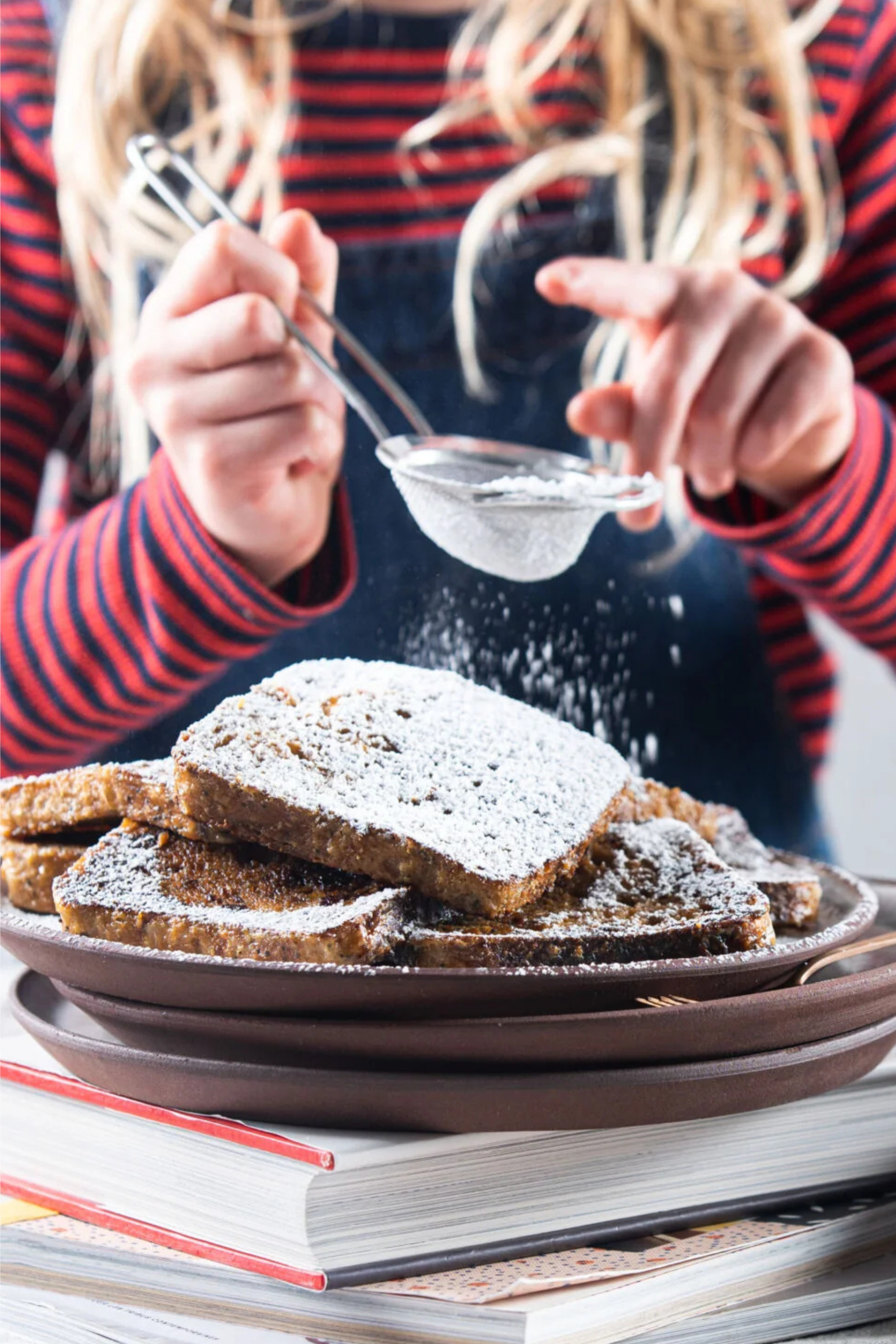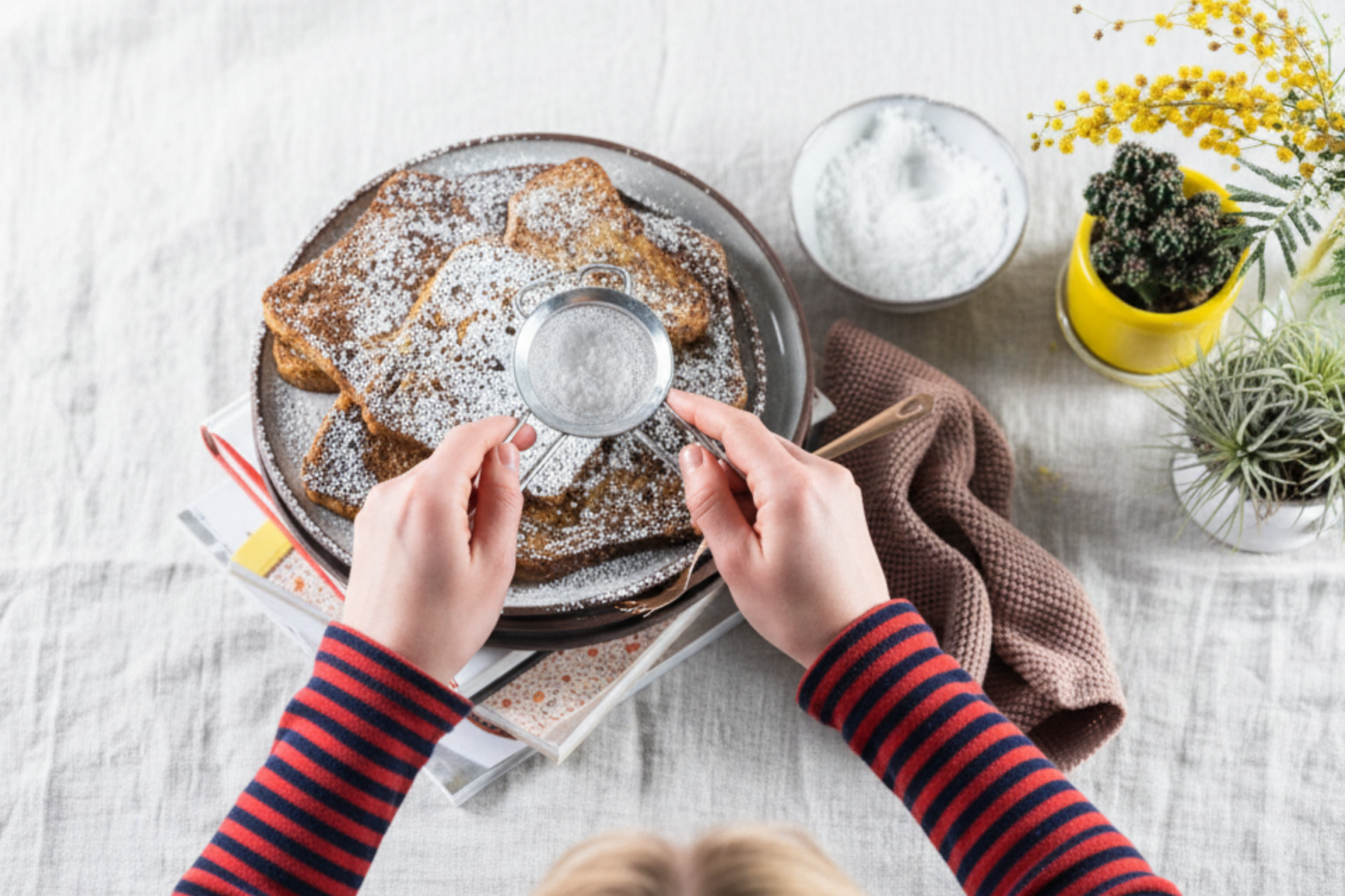 Disposez les tranches sur une assiette et saupoudrez de sucre glace. Servez de préférence avec des fruits de saison frais, un peu de yaourt ou tout simplement nature, comme Sofie Dumont le recommande — avec une tasse de café.
