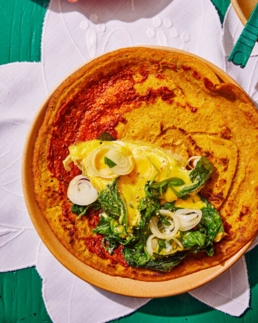 Étalez une couche d'harissa sur une crêpe, ajoutez un peu des œufs aux épinards et pliez.