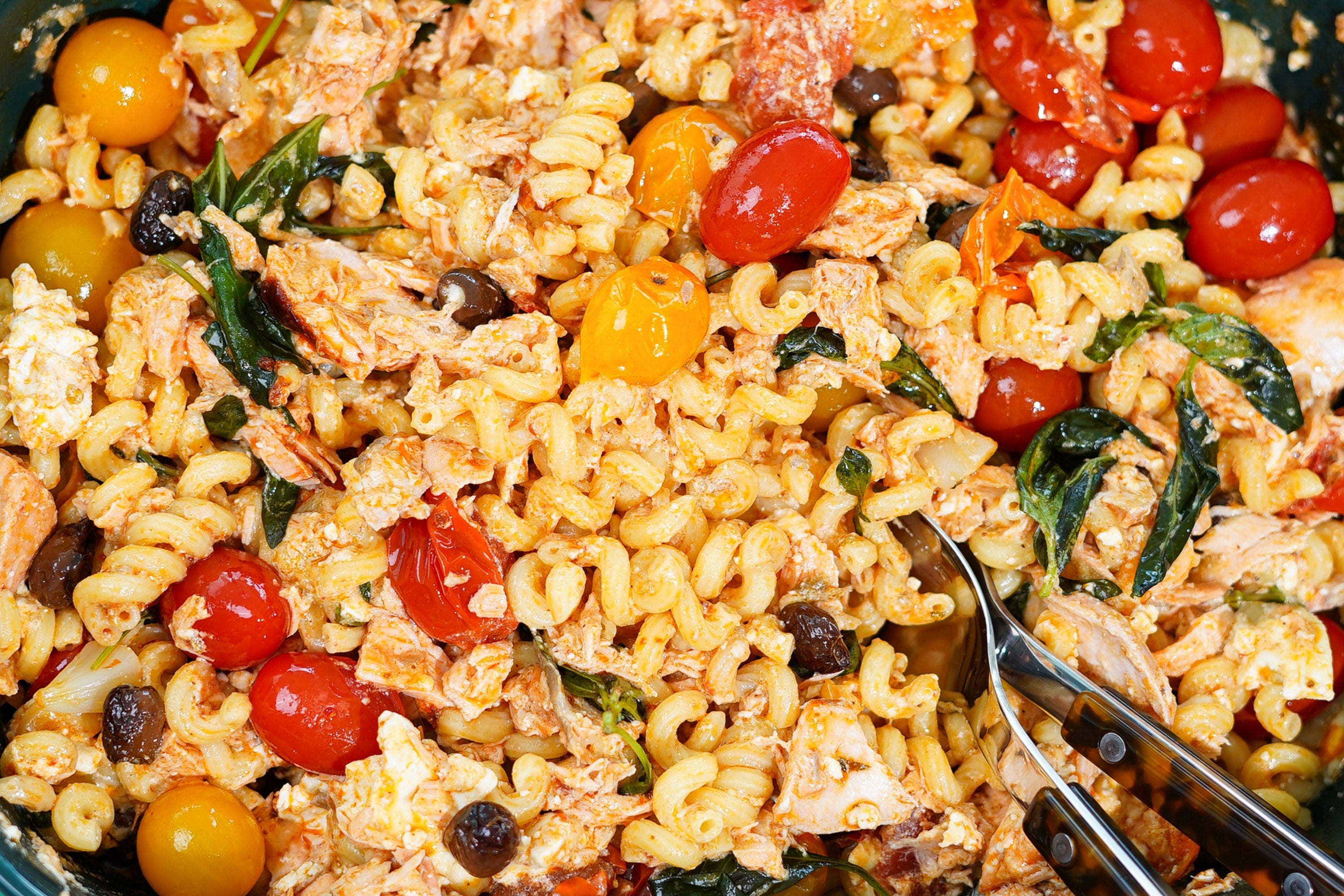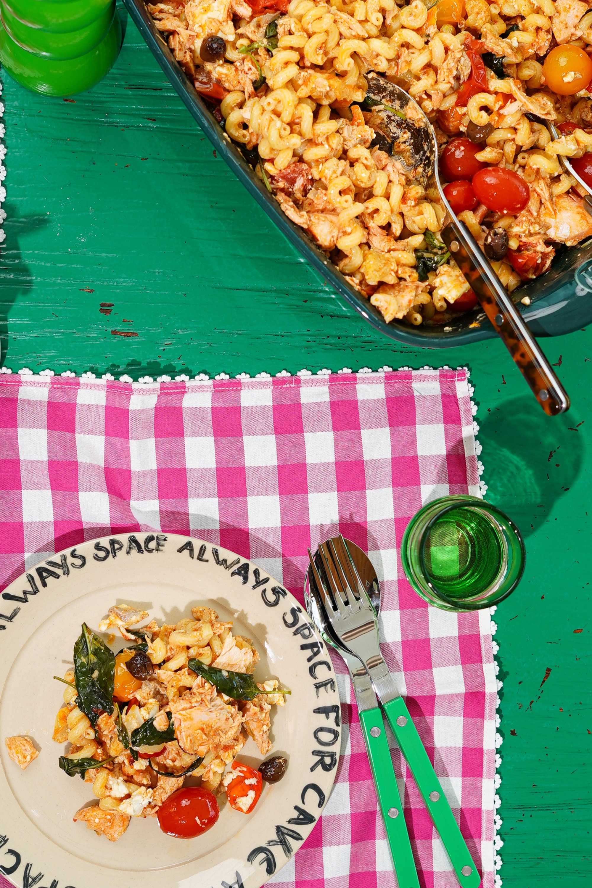 Pâtes avec feta, saumon et harissa, tomates cerises confites et ail au four