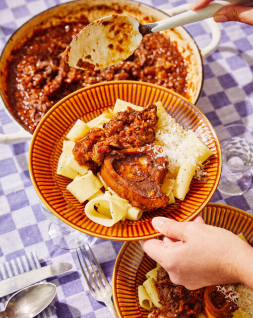 Servez l'ossobuco sur les pâtes, garni de moelle, de fromage et de persil.