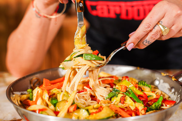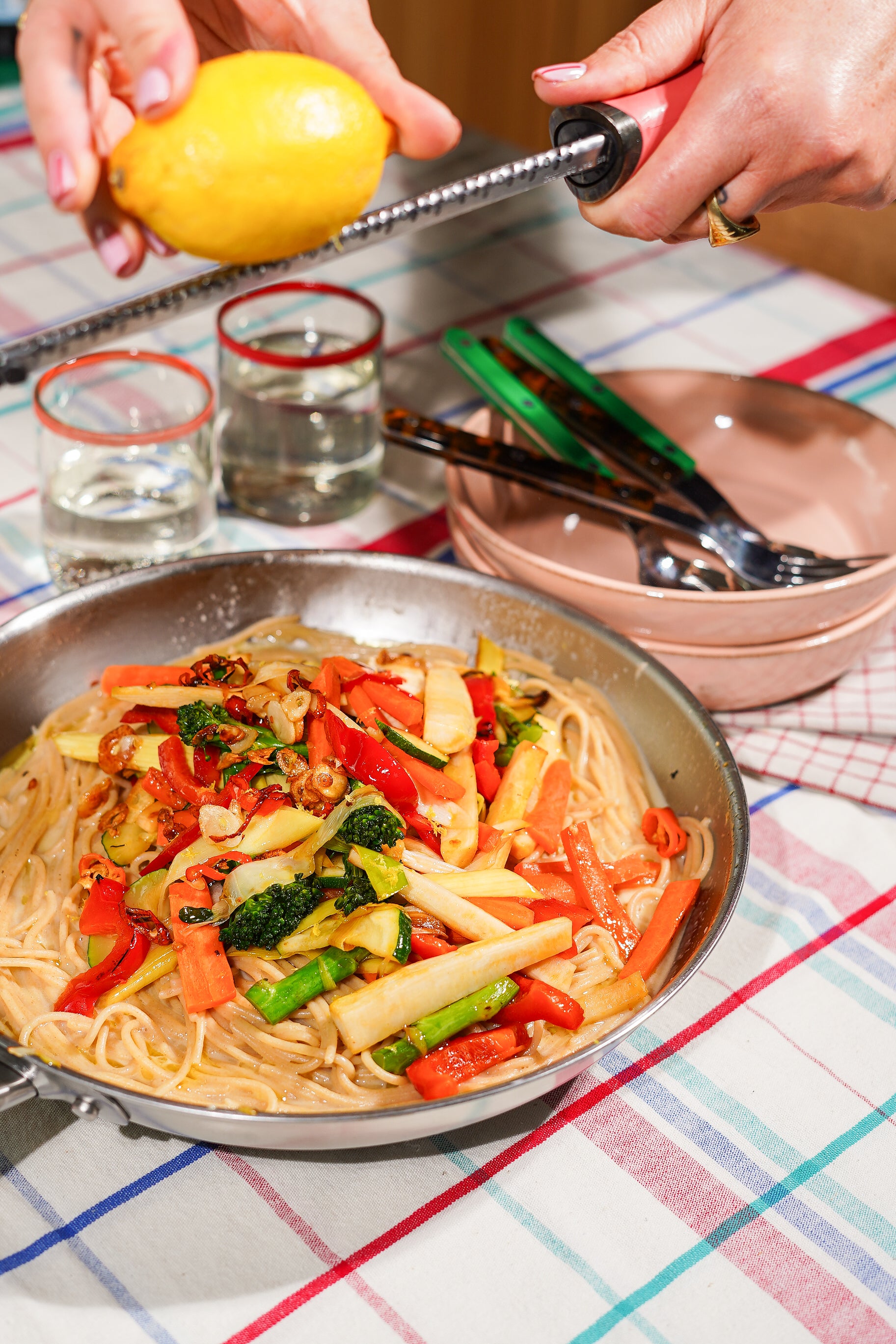Incorporez les légumes sautés, l'ail et le piment aux pâtes. Ajoutez du jus de citron selon votre goût et terminez avec du parmesan râpé, un filet d'huile d'olive et, si vous le souhaitez, du persil ou du basilic frais.