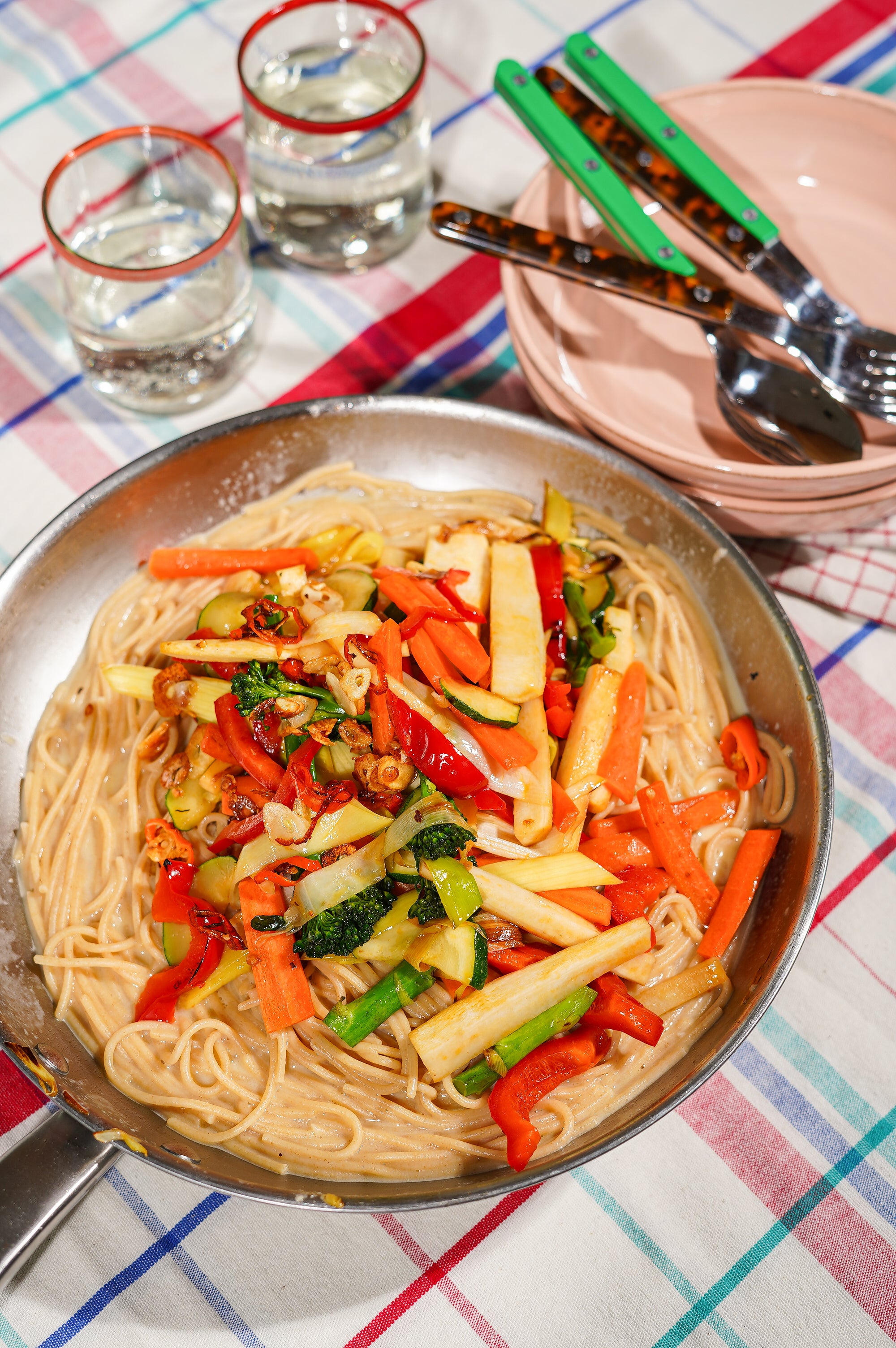 Si nécessaire, ajoutez un filet d'huile dans la même poêle et faites revenir à feu vif la carotte, le panais, le poireau, la courgette, le poivron et le brocoli (ou le bimi). Faites-les sauter brièvement pour qu'ils restent légèrement croquants tout en prenant une belle couleur. Poivrez et salez légèrement. Réservez avec l'ail et le piment.