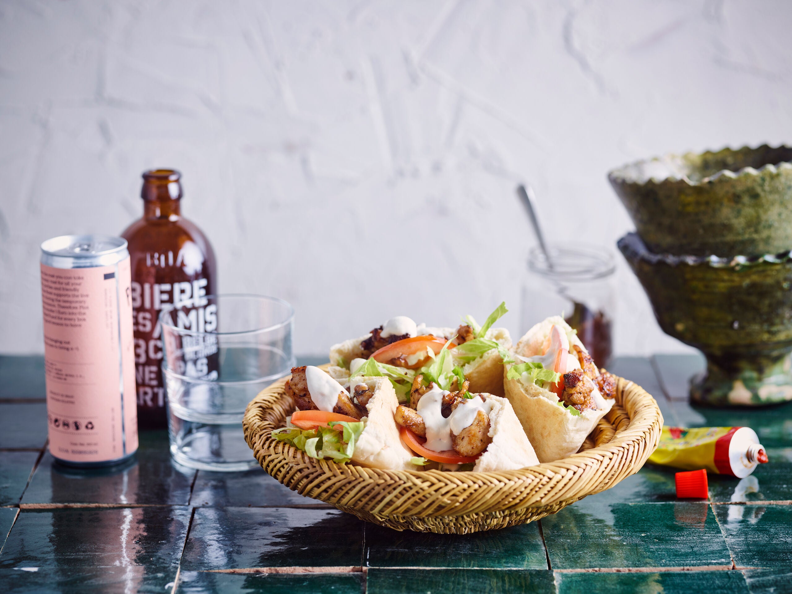 Pita avec du poulet gyros, houmous et sauce yaourt à l'ail et au tahini