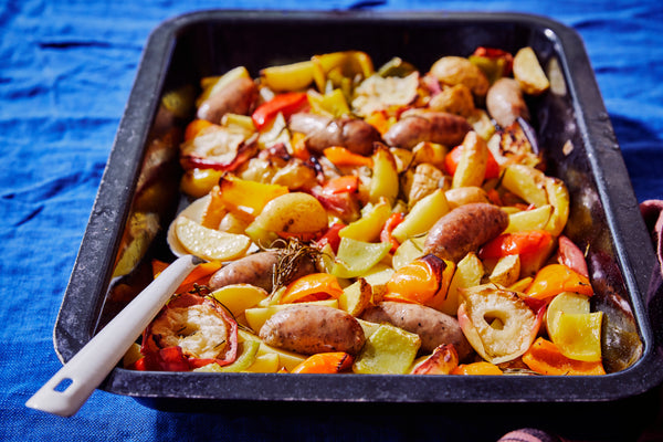 Aplatissez la saucisse au milieu entre le pouce et l'index et tournez-la sur elle-même pour former des saucisses plus petites, coupez-les avec des ciseaux. Répartissez le tout dans un grand plat à gratin.