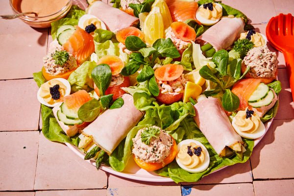 Pour la pêche au thon : Égouttez bien le thon et mélangez avec la mayonnaise, l'oignon rouge finement haché et la ciboulette. Assaisonnez avec du poivre et du sel, séchez légèrement les pêches et répartissez joliment le thon à l'intérieur, placez sur le plat.