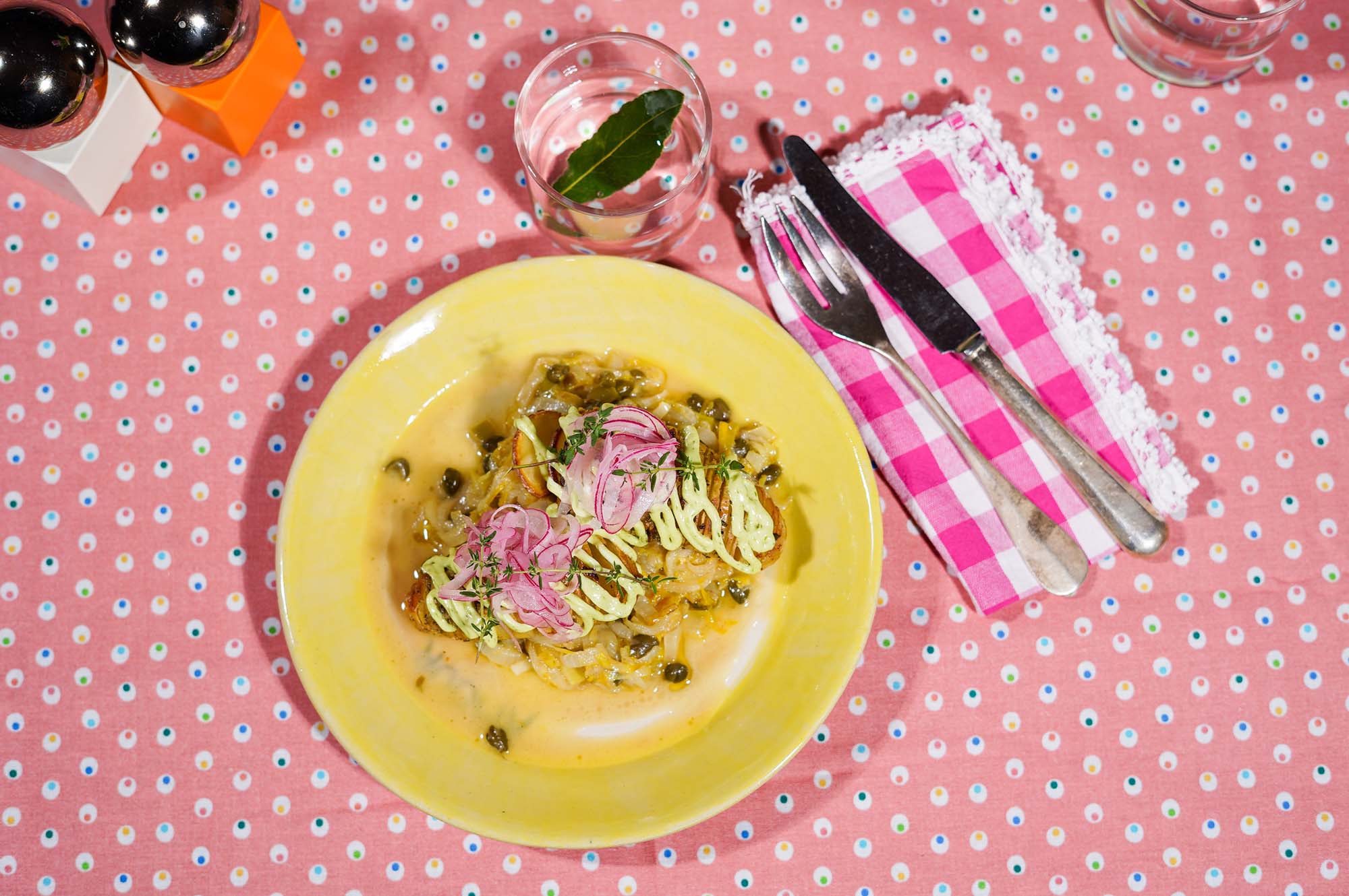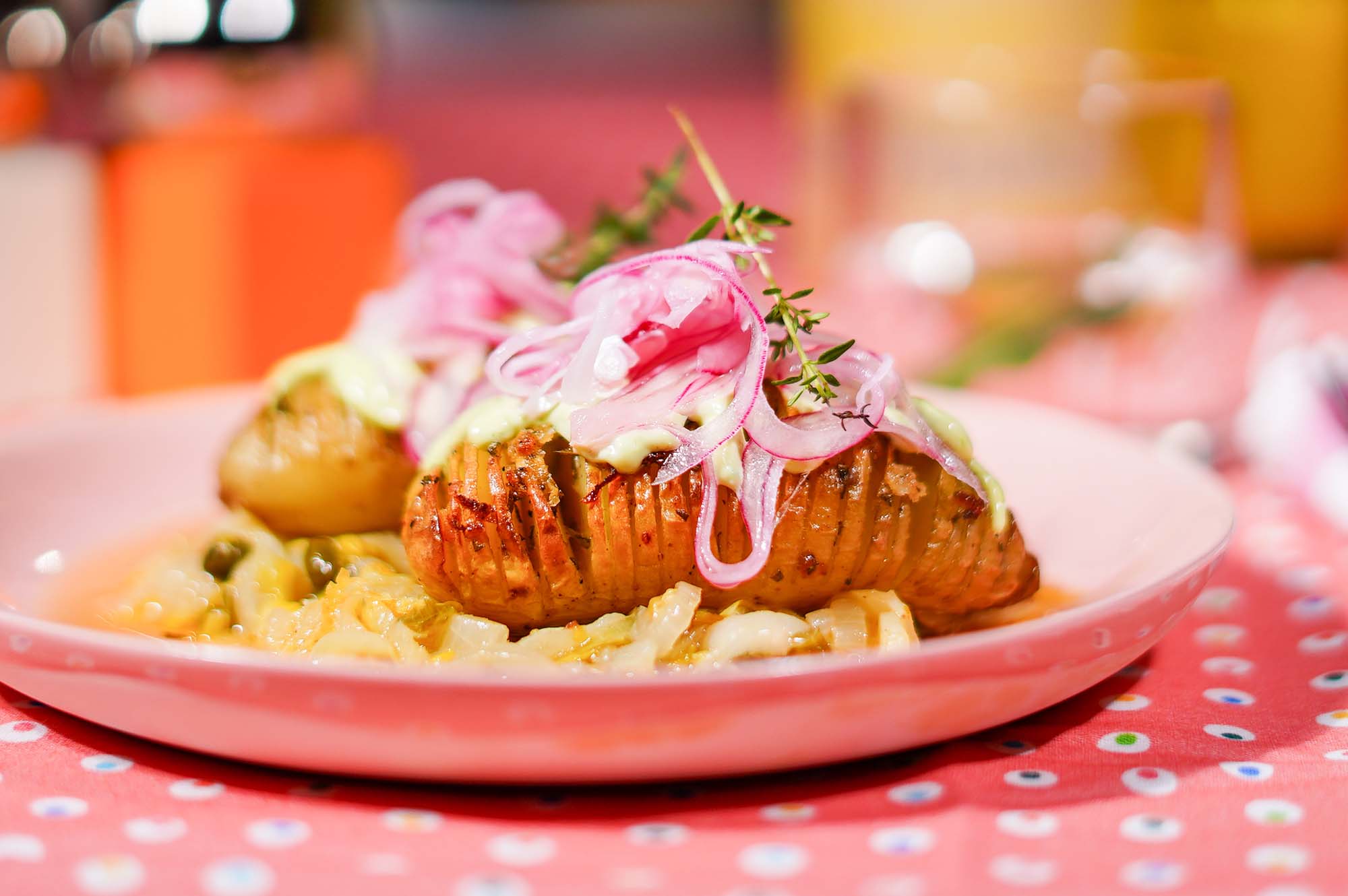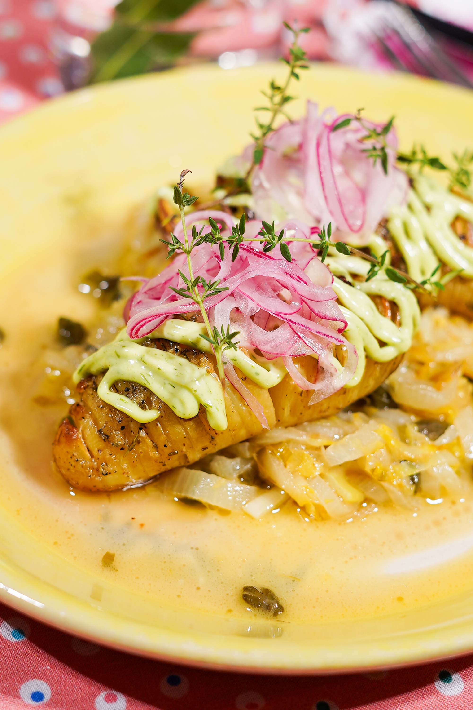 Pommes de terre Hasselback avec mayonnaise à la ciboulette, sur un lit de chicorée frite aux agrumes et câpres, et oignons rouges marinés