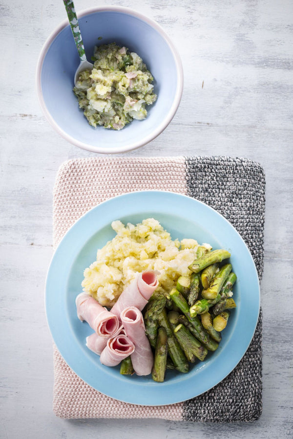 Assaisonnez le reste de la purée avec du sel et servez-la dans l'assiette. Ajoutez les asperges. Faites des rouleaux avec le reste du jambon et disposez-les à côté.
