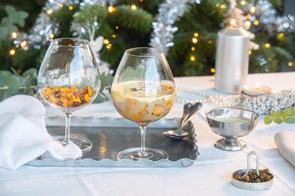 Assurez-vous que la soupe et la courge sont chaudes. Répartissez la courge dans des verres, servez-y la soupe. Ajoutez un peu de crème au curry et saupoudrez de câpres frites.
