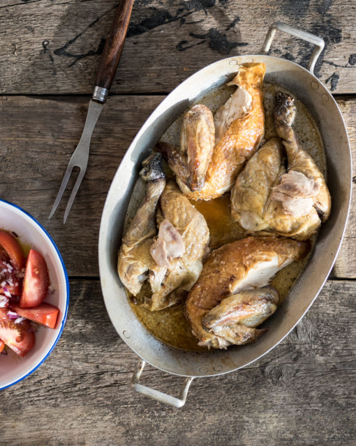 Placez le poulet dans un plat allant au four et frottez-le avec du beurre. Saupoudrez-le de sel et de poivre. Le poulet est maintenant prêt à cuire au four pendant 60 minutes à 185°. Arrosez le poulet de temps en temps avec le jus. Pour être sûr que le poulet est cuit, piquez entre la chair de la poitrine et la cuisse avec une fourchette à viande, soulevez et inclinez, si le jus qui s'en écoule est clair, alors il est cuit.