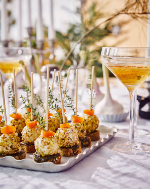 Disposez sur les pains à l'ail et piquez avec un cure-dent avec un morceau d'abricot et un brin de thym. Versez du miel sur les boulettes de fromage de chèvre.