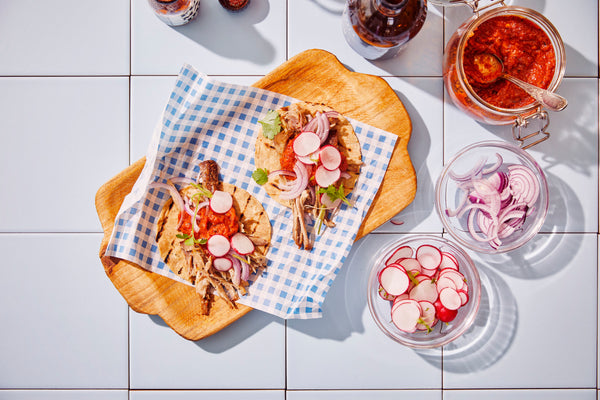 Pour servir griller les tacos de chaque côté pendant 15 secondes, placez beaucoup de porc effiloché dessus, et la sauce, l'oignon, le radis et le persil et servir immédiatement! Servir de la sauce piquante pour les fans de Spicy 😉