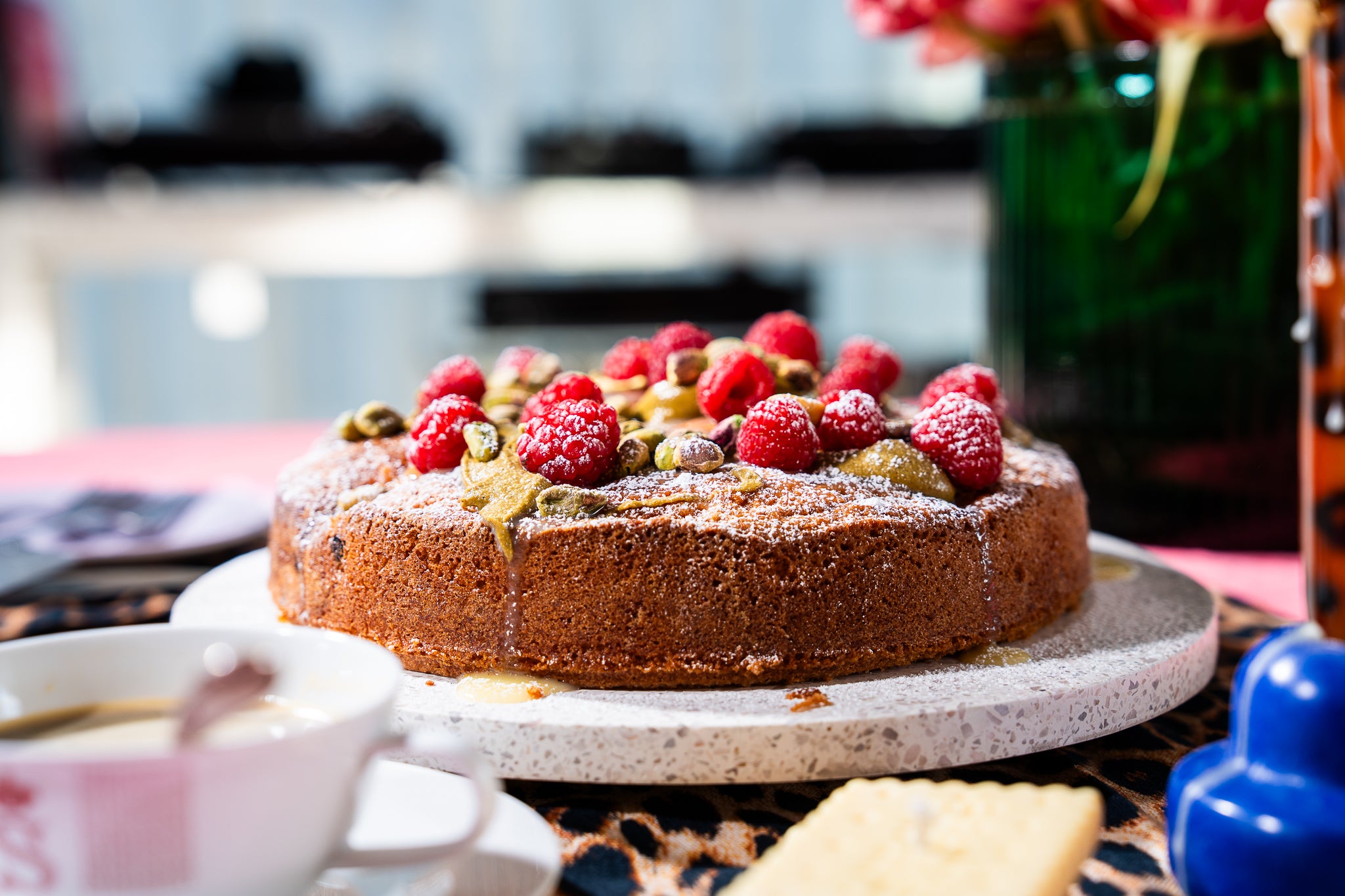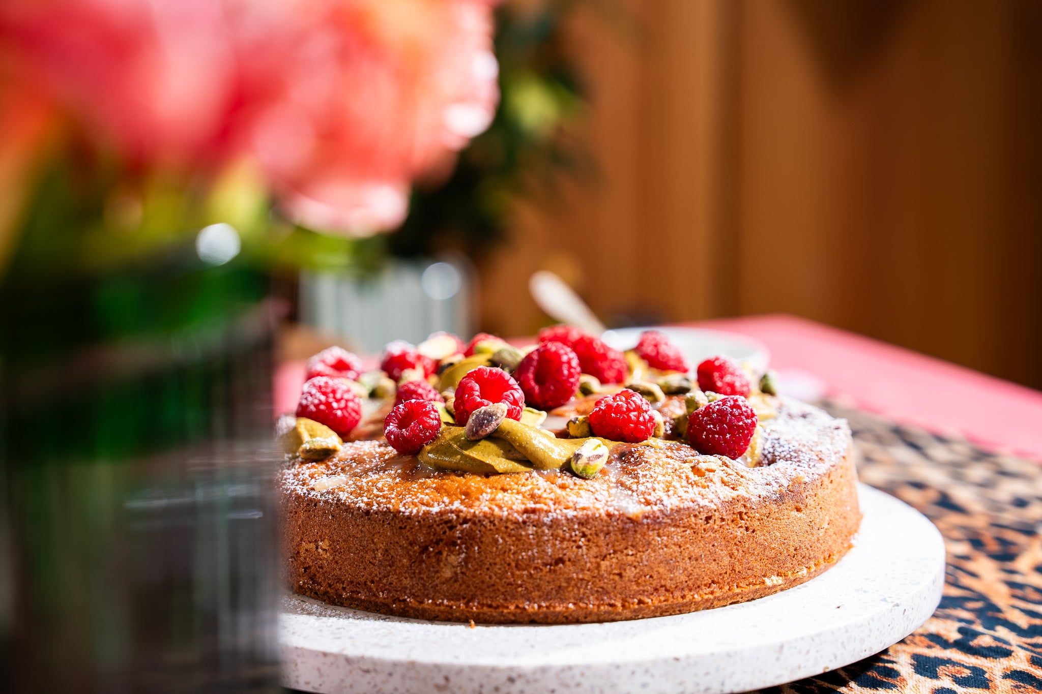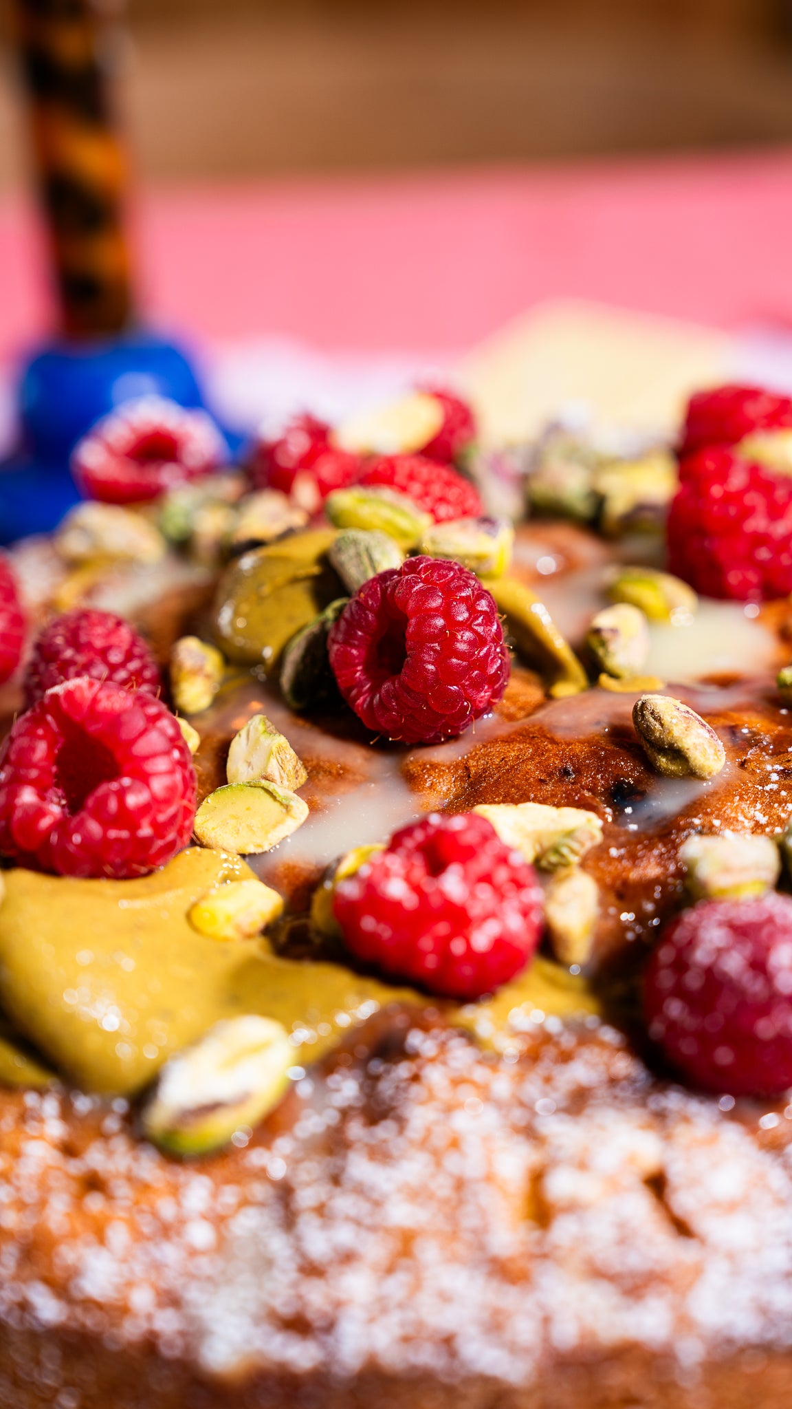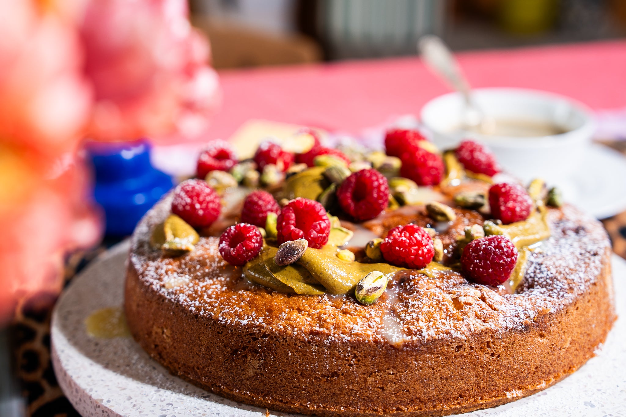 Gâteau quatre-quarts aux framboises, pistache et ganache au chocolat blanc