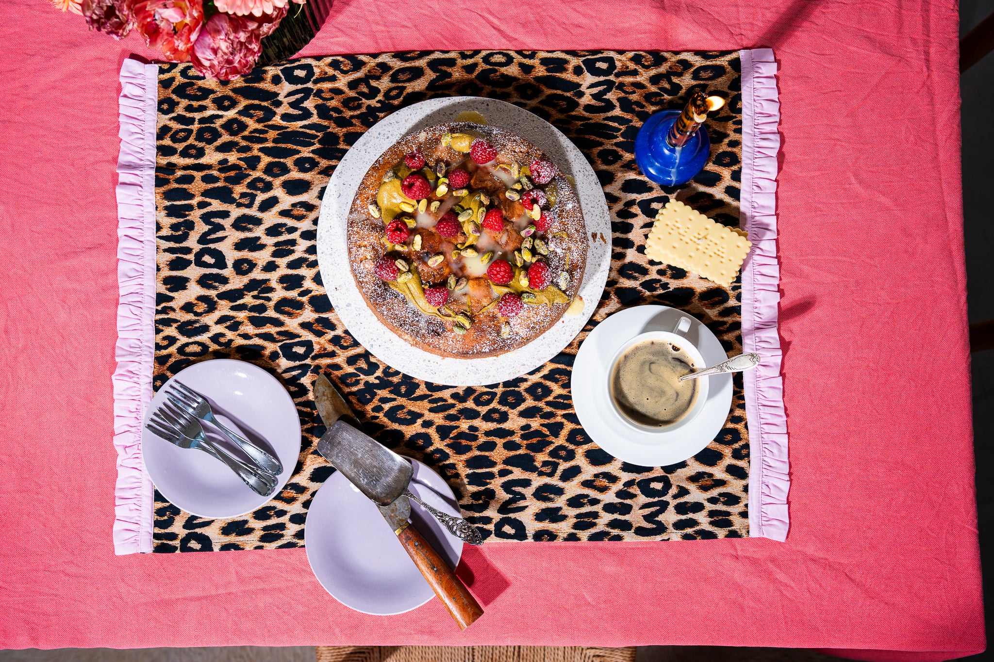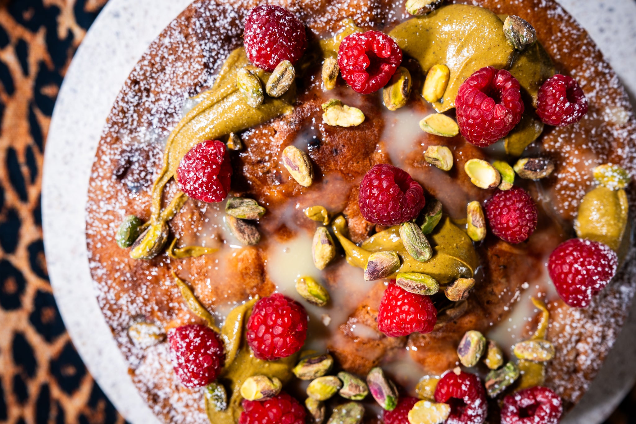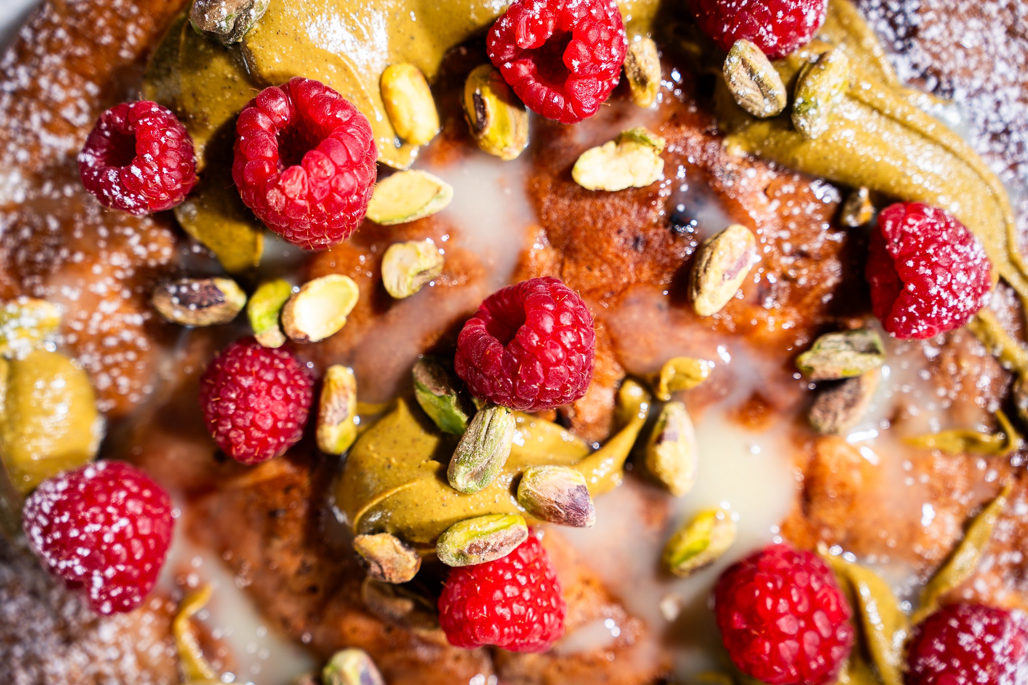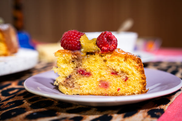 Gâteau quatre-quarts aux framboises, pistache et ganache au chocolat blanc