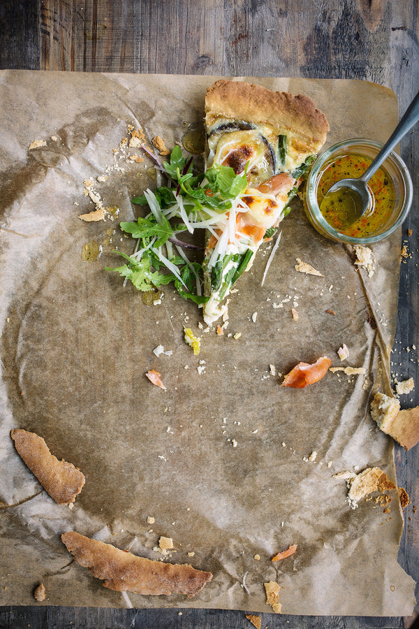 Placez une feuille de papier sulfurisé dans un moule à gâteau et mettez-y la pâte. Placez une deuxième feuille de papier sulfurisé sur la pâte et couvrez le fond de haricots secs, de riz ou de lentilles. Faites cuire la pâte à quiche au four pendant environ 30 minutes jusqu'à ce qu'elle soit bien croustillante.