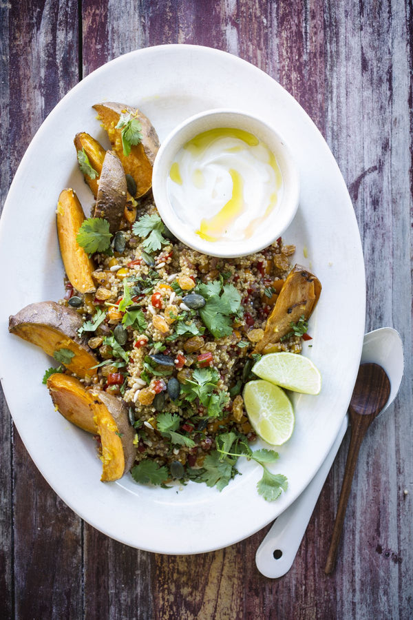 Mélangez le quinoa avec les poivrons. Assaisonnez avec du poivre et du sel et éventuellement du jus de citron vert. Parsemez de menthe et de coriandre. Terminez avec les raisins secs et les graines de tournesol et/ou de citrouille. Retirez les patates douces du four et disposez-les sur le quinoa.