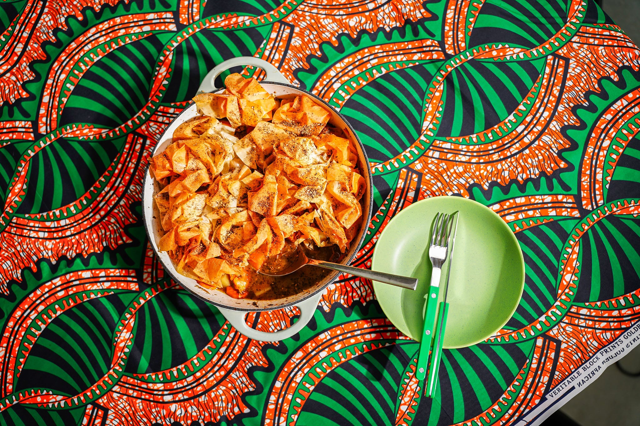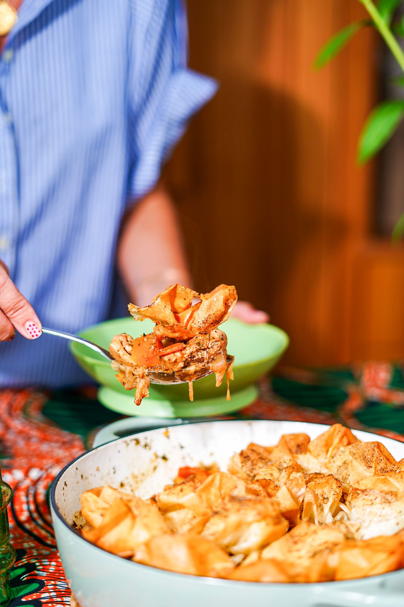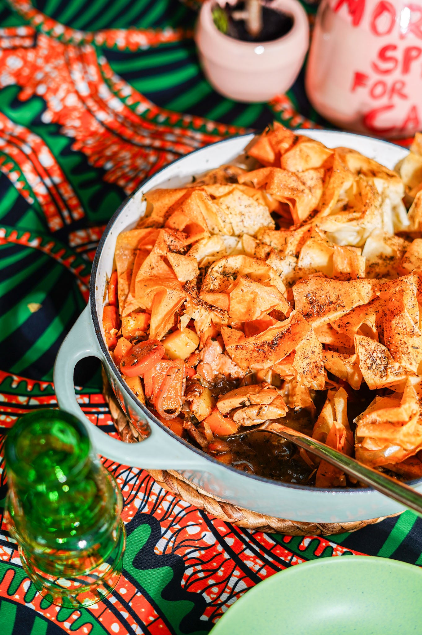 Servez le ragoût dans un grand bol et placez dessus le couvercle de pâte filo croustillante. Évider en cassant la croûte.