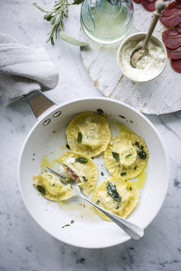 Ajoute les raviolis à la marjolaine et à la sauge. Fais revenir brièvement et ajoute un peu d'eau de cuisson.