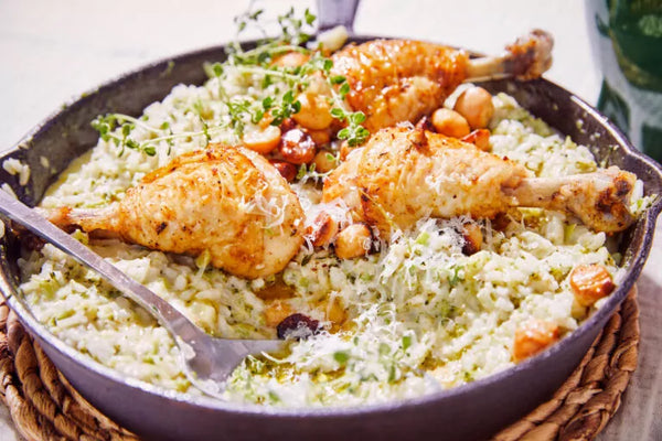 Servez le risotto avec les cuisses de poulet, les noix de macadamia et le thym. Terminez avec un peu de pecorino râpé supplémentaire.