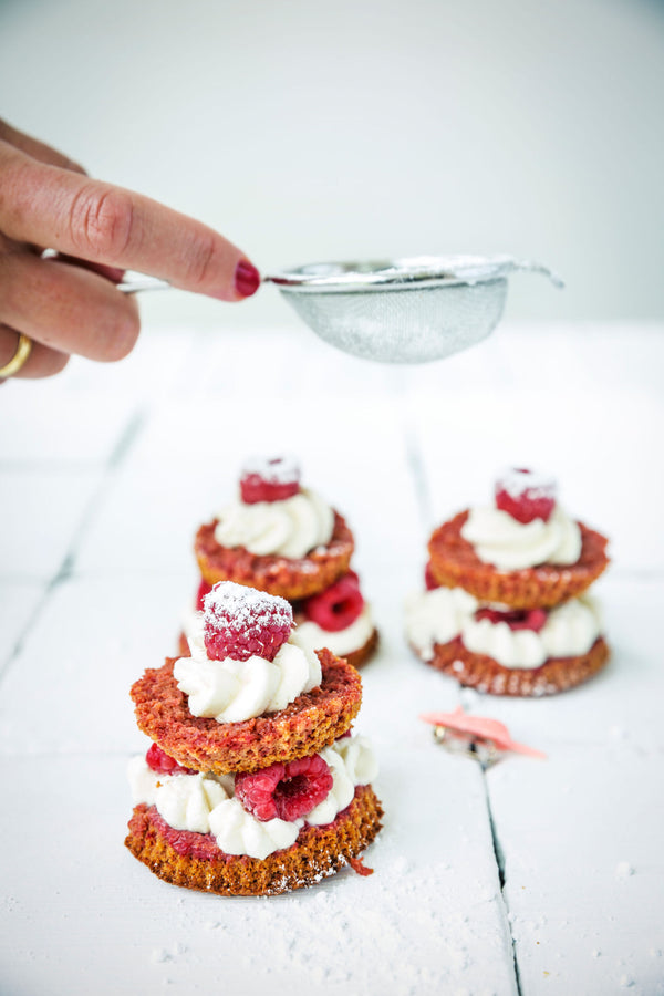 Coupez chaque cupcake en deux. Pochez de la crème fouettée sur la moitié inférieure, ajoutez quelques framboises et recouvrez avec la moitié supérieure. Terminez avec de la crème fouettée, une framboise et éventuellement du sucre glace.