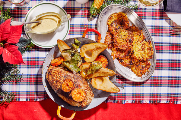 Ajoutez les poires et les mandarines pendant les 15 dernières minutes avec le rôti pour qu'elles cuisent bien. Avant de servir, coupez le rôti en tranches d'1 cm, servez chaque tranche avec une poire, une mandarine, la sauce et le rösti.