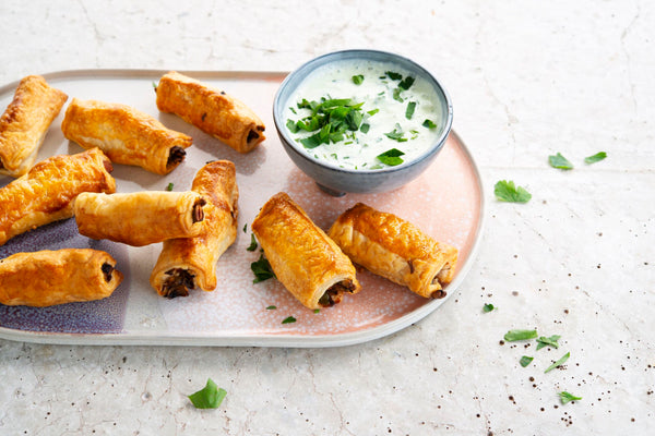 Déposez une bonne cuillère de farce au centre de chaque morceau de pâte feuilletée. Appuyez sur la farce et roulez la pâte feuilletée. Disposez les rouleaux avec l'ouverture vers le haut sur la plaque de cuisson.