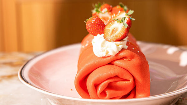 Mettez tous les ingrédients pour les crêpes dans un grand récipient et mixez pendant 2 à 3 minutes jusqu'à obtenir une pâte lisse avec un mixeur plongeant. Pour conserver la belle couleur rose, faites cuire les crêpes à feu moyen, pas trop chaud donc. Chauffez la poêle, frottez-la avec un peu de beurre et faites cuire 6 belles crêpes rondes et uniformes. Empilez-les, couvrez-les et laissez-les refroidir complètement.