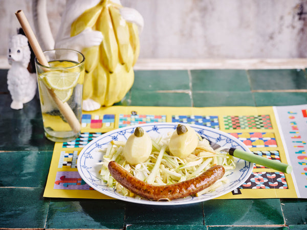 Disposez les pommes de terre chaudes et les chipolatas cuites à côté ou sur la salade. Servez le tout ensemble, par exemple dans une assiette ou un grand plat afin que chacun puisse se servir.