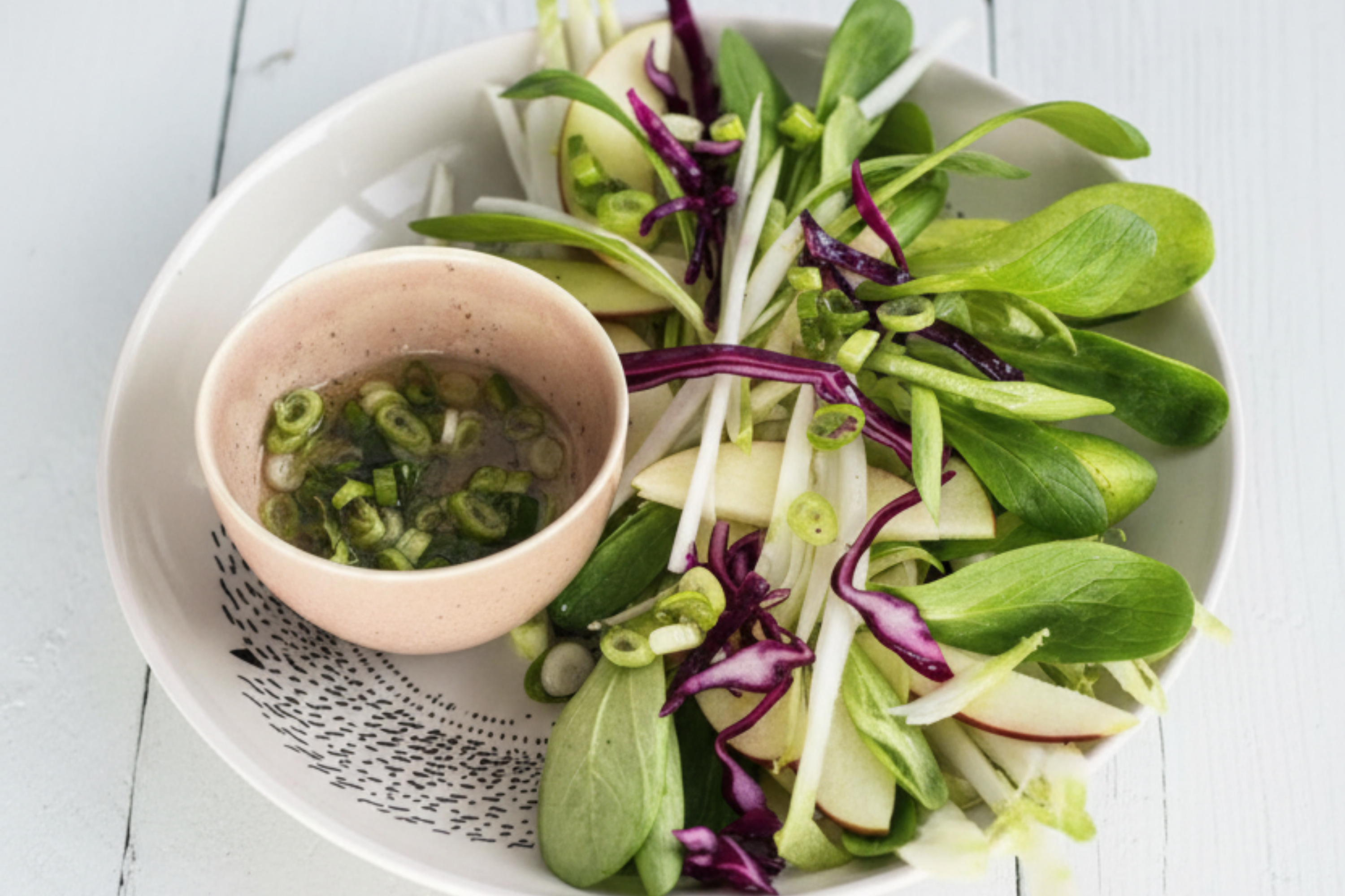 Mélangez les jeunes oignons finement hachés avec l’huile d’olive et le vinaigre de vin blanc. Assaisonnez avec du sel de mer et du poivre.