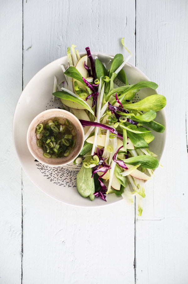Retirez la partie dure des endives et coupez-les en fines lanières. Disposez-les sur une assiette. Lavez la mâche et ajoutez-la. Coupez la pomme en fines tranches et ajoutez-la également. Répartissez ensuite un peu de chou rouge sur la salade.