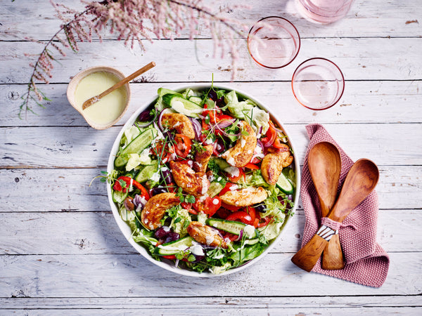 Salade grecque avec poulet chaud et sauce feta