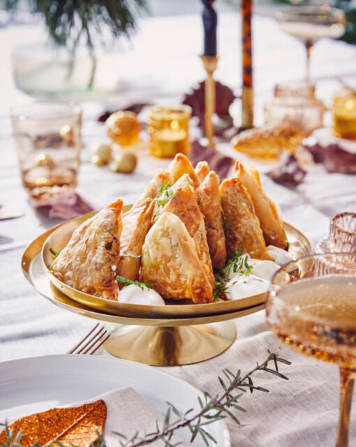 Samosa végétarienne avec dip feta-burrata et un filet de miel épicé