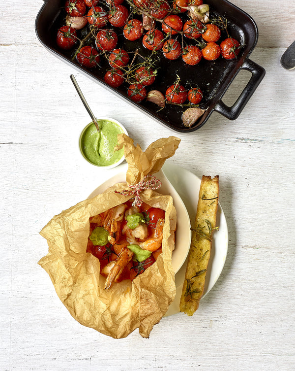 Ouvrez chaque papillot d'un côté. Servir le Scampis donc, fini avec de petites tomates et du pesto. Servir la focaccia.