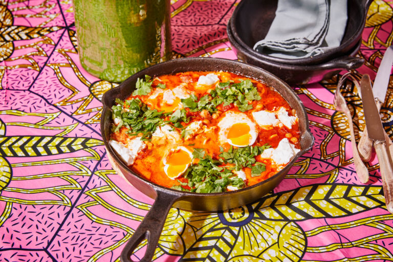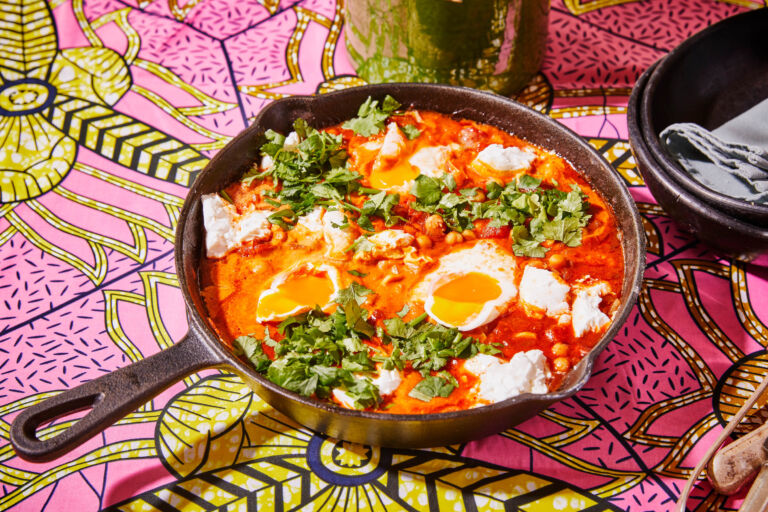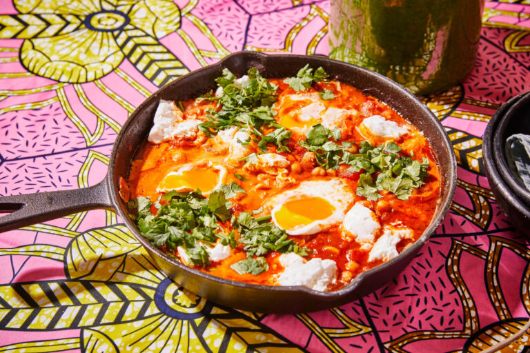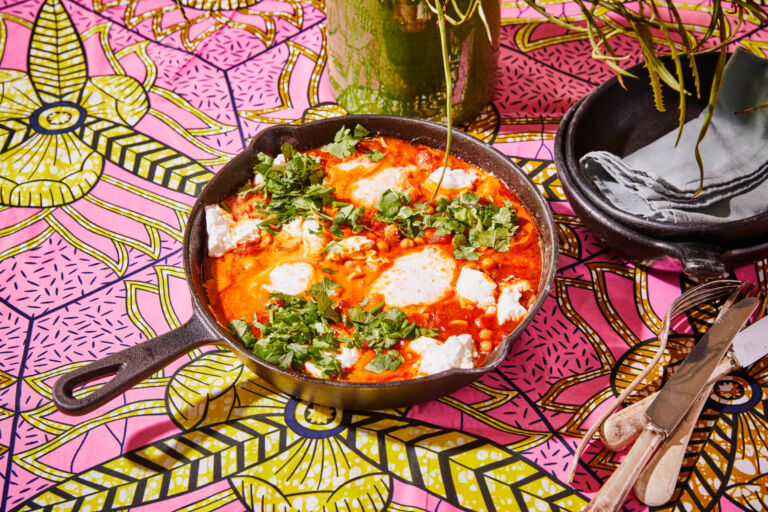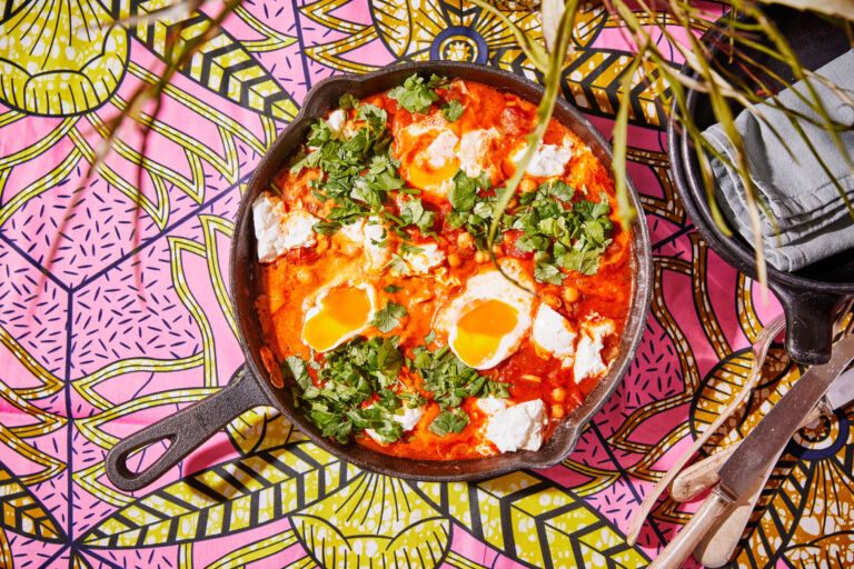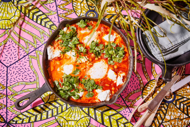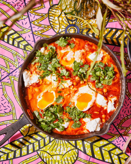 Shakshuka avec des pois chiches et du fromage de chèvre frais