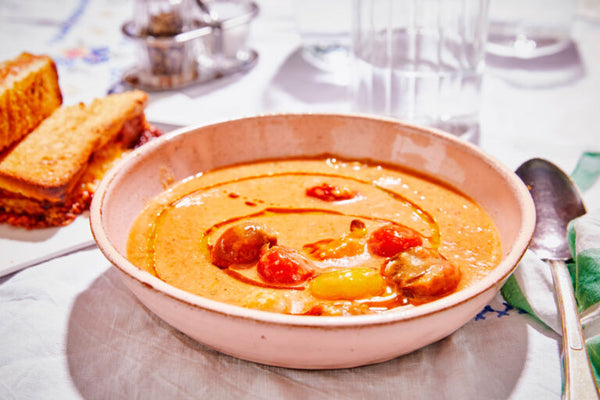 Service : Répartissez la soupe dans les assiettes et servez avec les croques merguez fromage à côté.