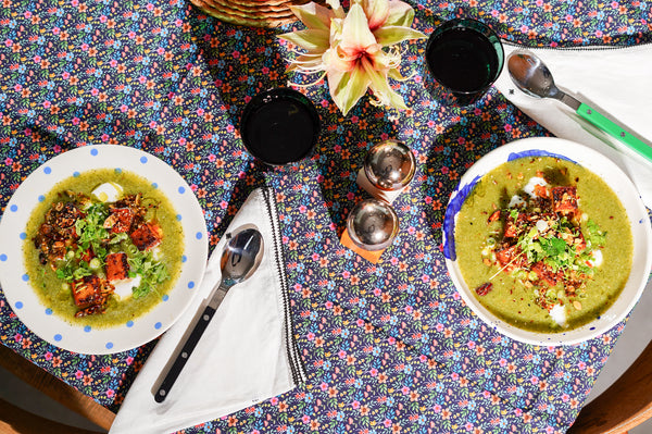 Soupe de courgette-brocoli avec tofu mariné et tempeh
