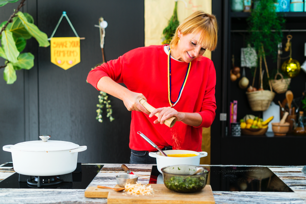 Soupe de potiron avec des scampis et salsa au sésame et coriandre