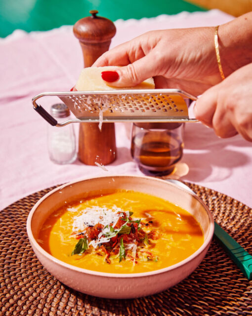 Servir : Répartissez la soupe dans des bols et déposez les croûtons chorizo par-dessus. Garnissez de persil plat haché grossièrement et éventuellement de parmesan râpé supplémentaire.