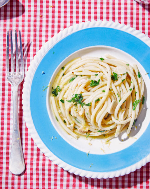 Service : Utilisez une louche et des pinces pour enrouler joliment les spaghetti et les disposer dans l'assiette. Terminez avec du poivre noir fraîchement moulu, du persil haché, du zeste de citron et quelques gouttes de colatura di alici par personne. Servez immédiatement pour la meilleure expérience gustative.