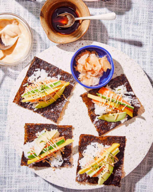 Tacos nori avec saumon, avocat, mangue et mayo épicée