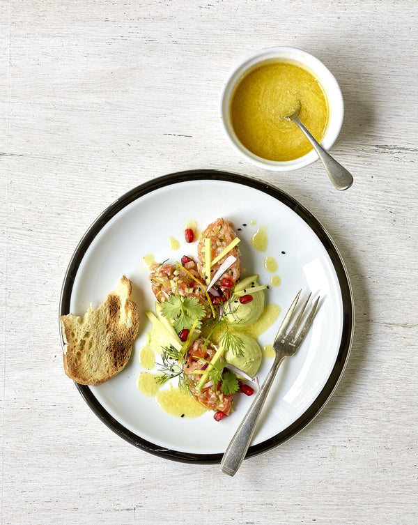 Tartare de duo de saumon avec crème d'avocat et huile de raifort