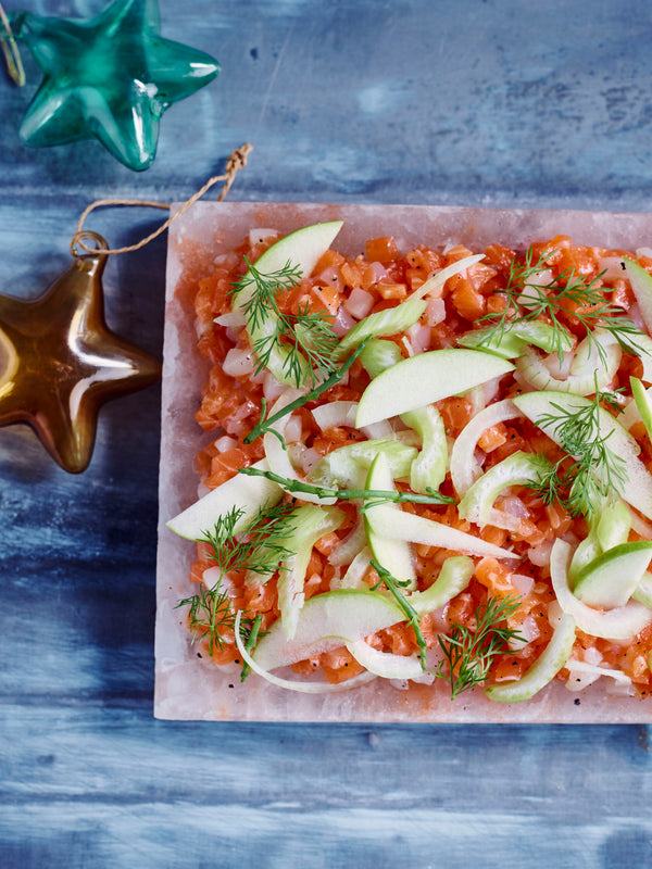 Tartare de saumon et de coquilles Saint-Jacques sur pierre de sel