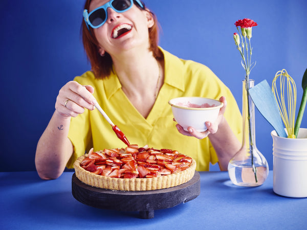 Coupez les fraises en deux et disposez-les sur la tarte.