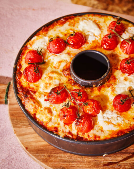 Sortez la tarte du four et décorez avec quelques feuilles de basilic.