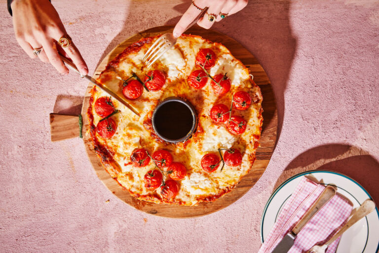 Coupez les tomates cerises en 3 et décorez le dessus de la tarte avec ces tomates et les billes de mozzarella.