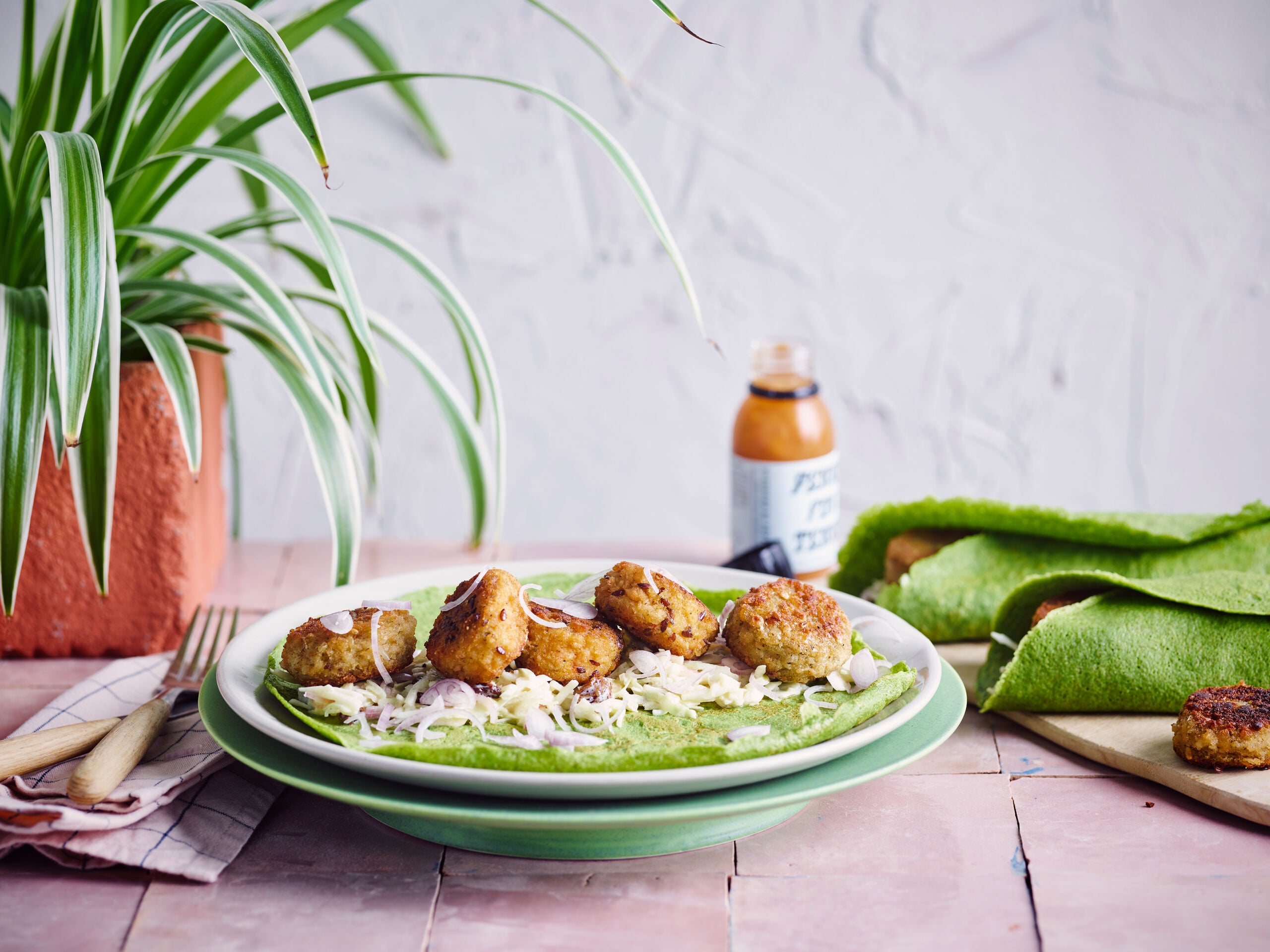 Tortilla aux épinards, chou et boulettes de viande frites