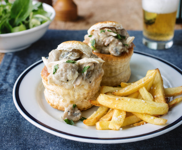 Remplissez les feuilletés avec le vol-au-vent, remettez le couvercle et servez avec les frites.