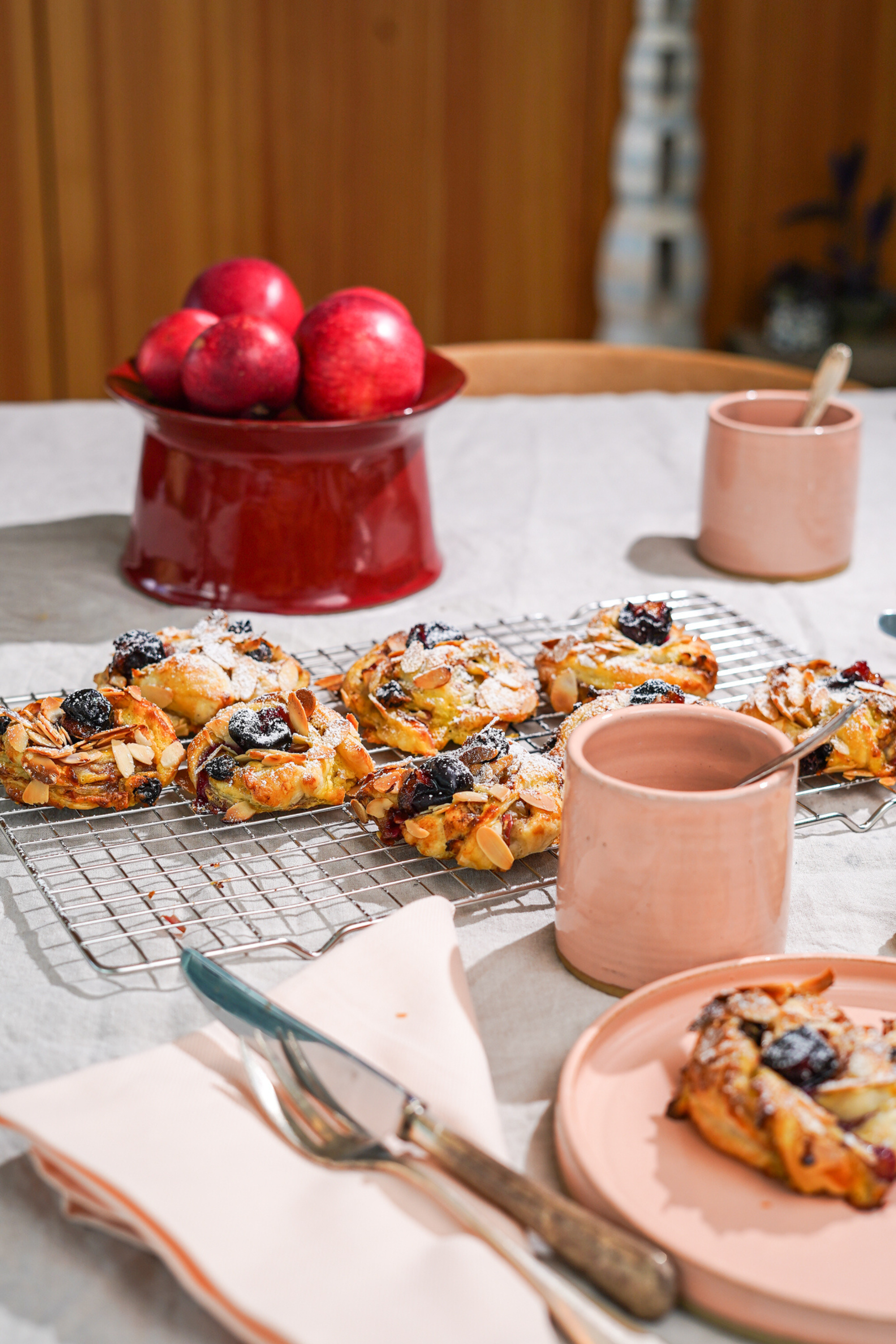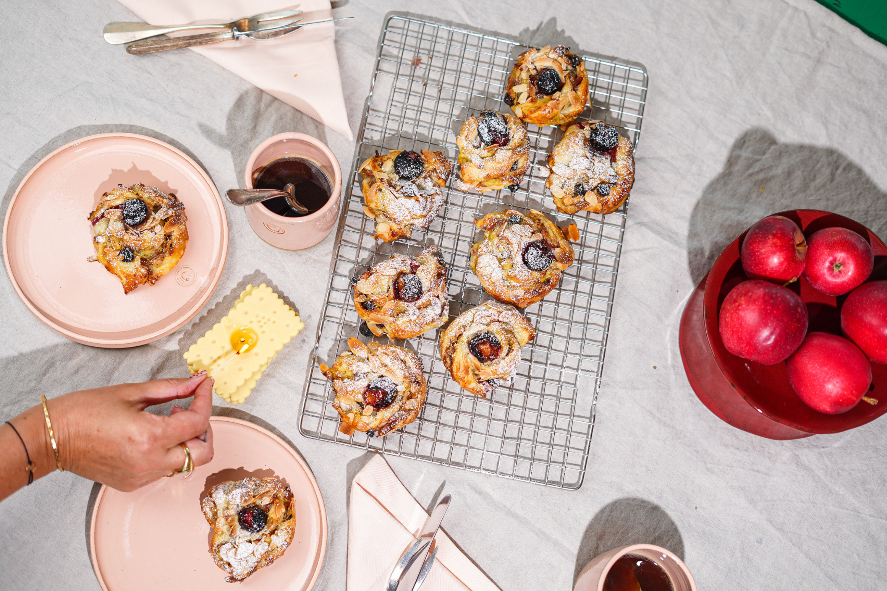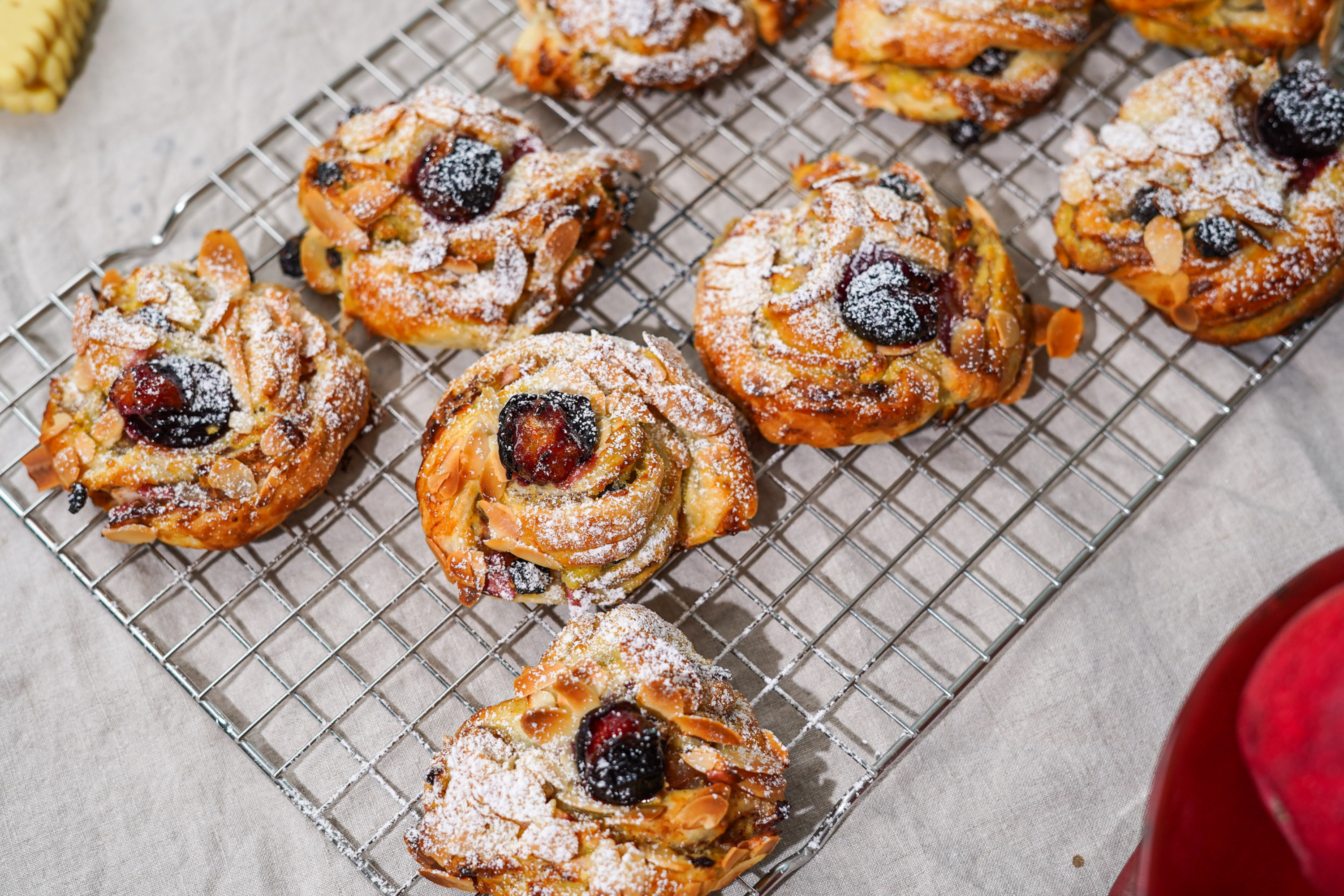 Badigeonnez les nœuds de Dorure. Saupoudrer de copeaux d'amandes et d'un peu de sucre glace.