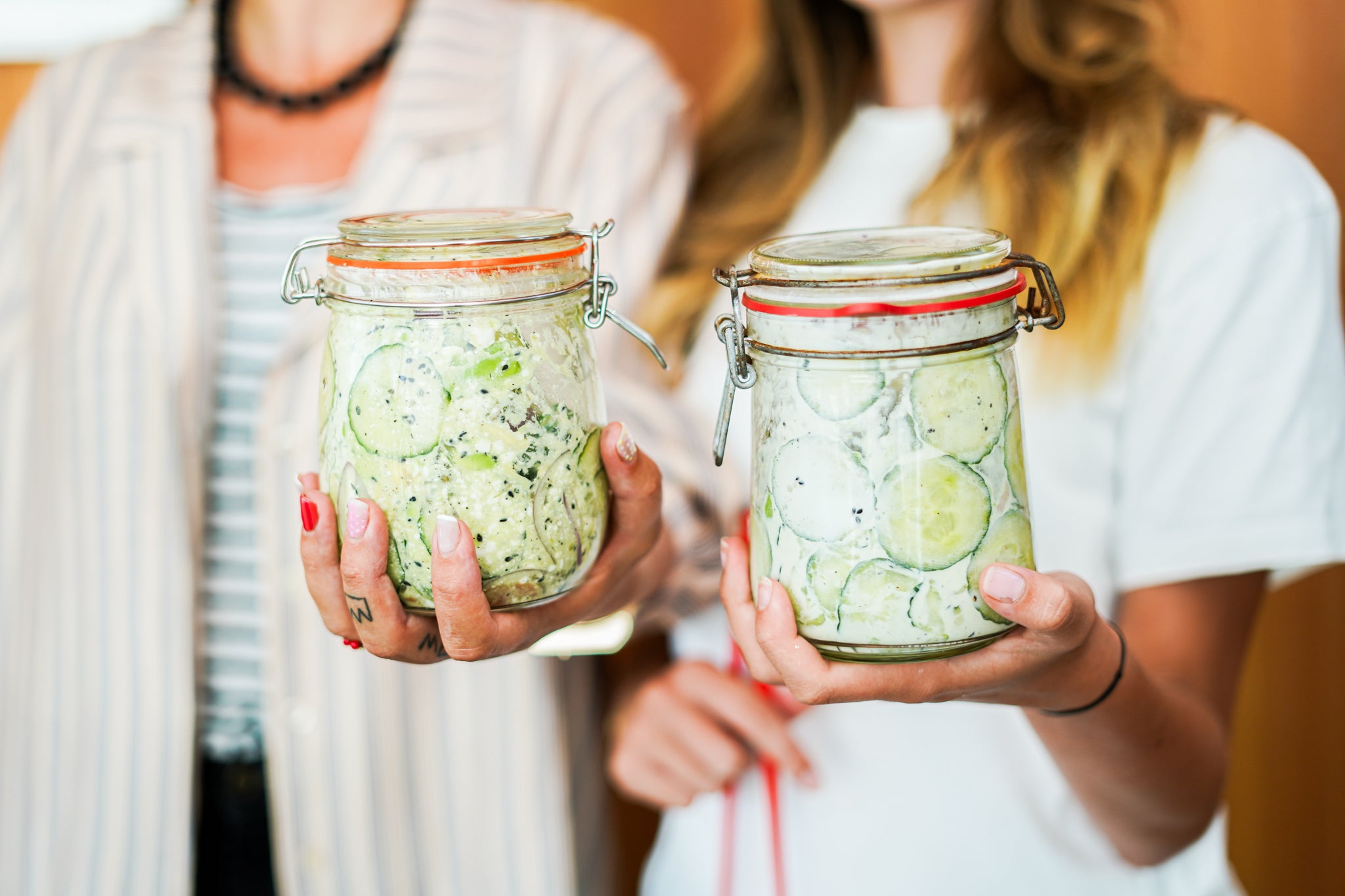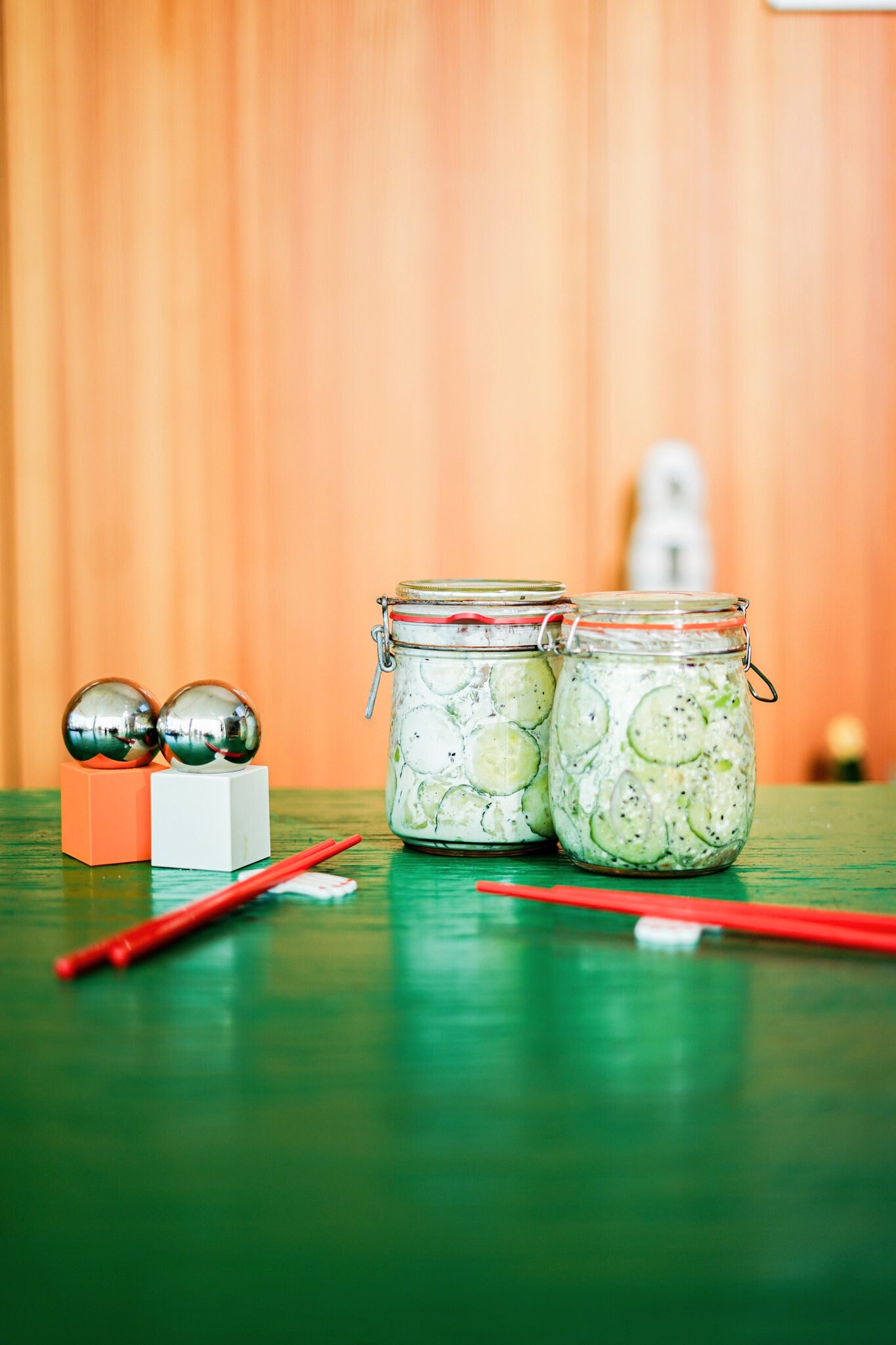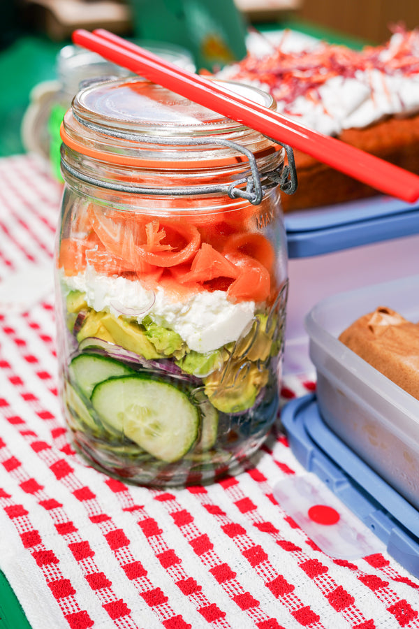 Salade de concombre avec du saumon fumé, avocat et fromage à la crème dans un pot de conserve