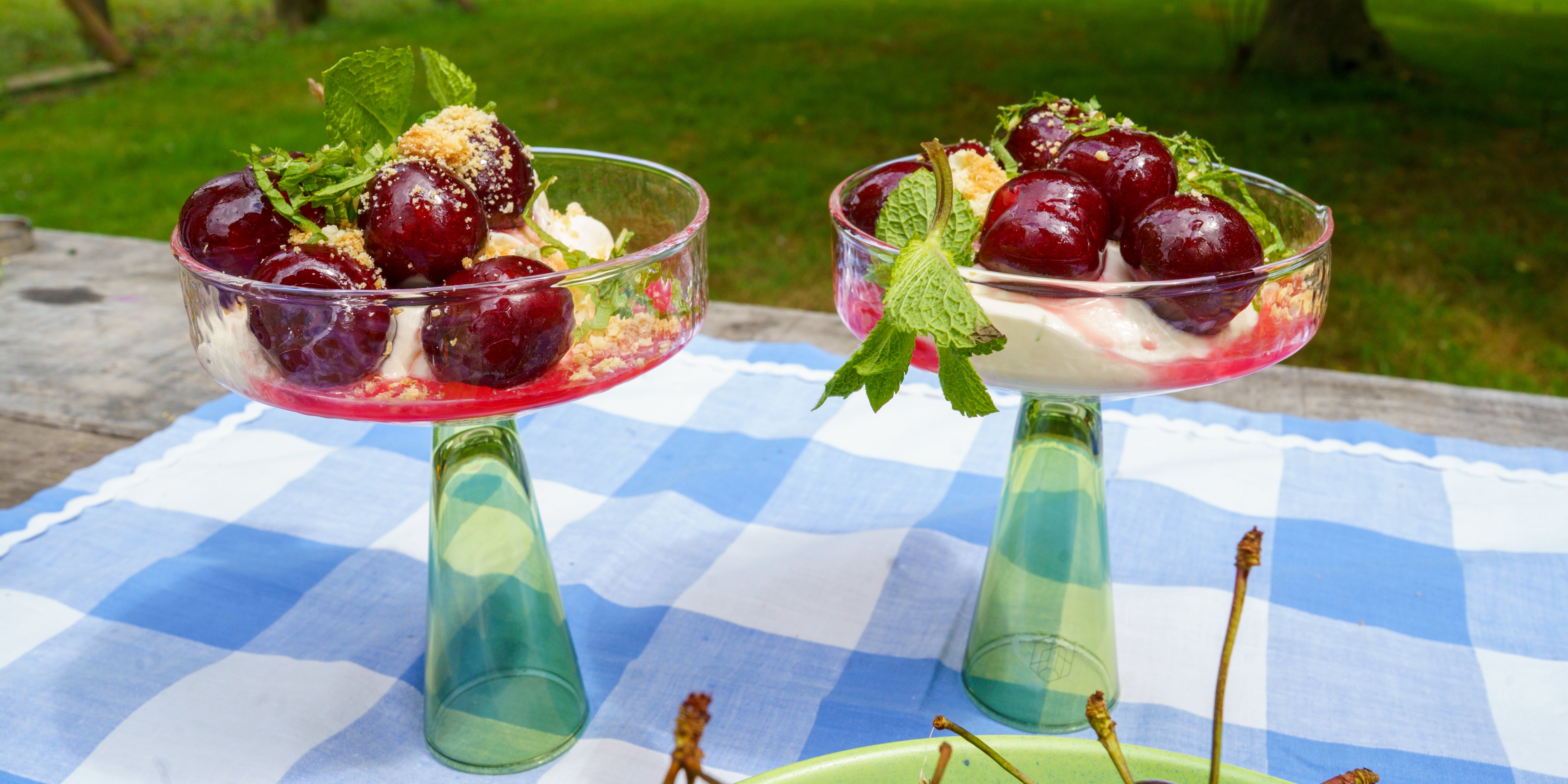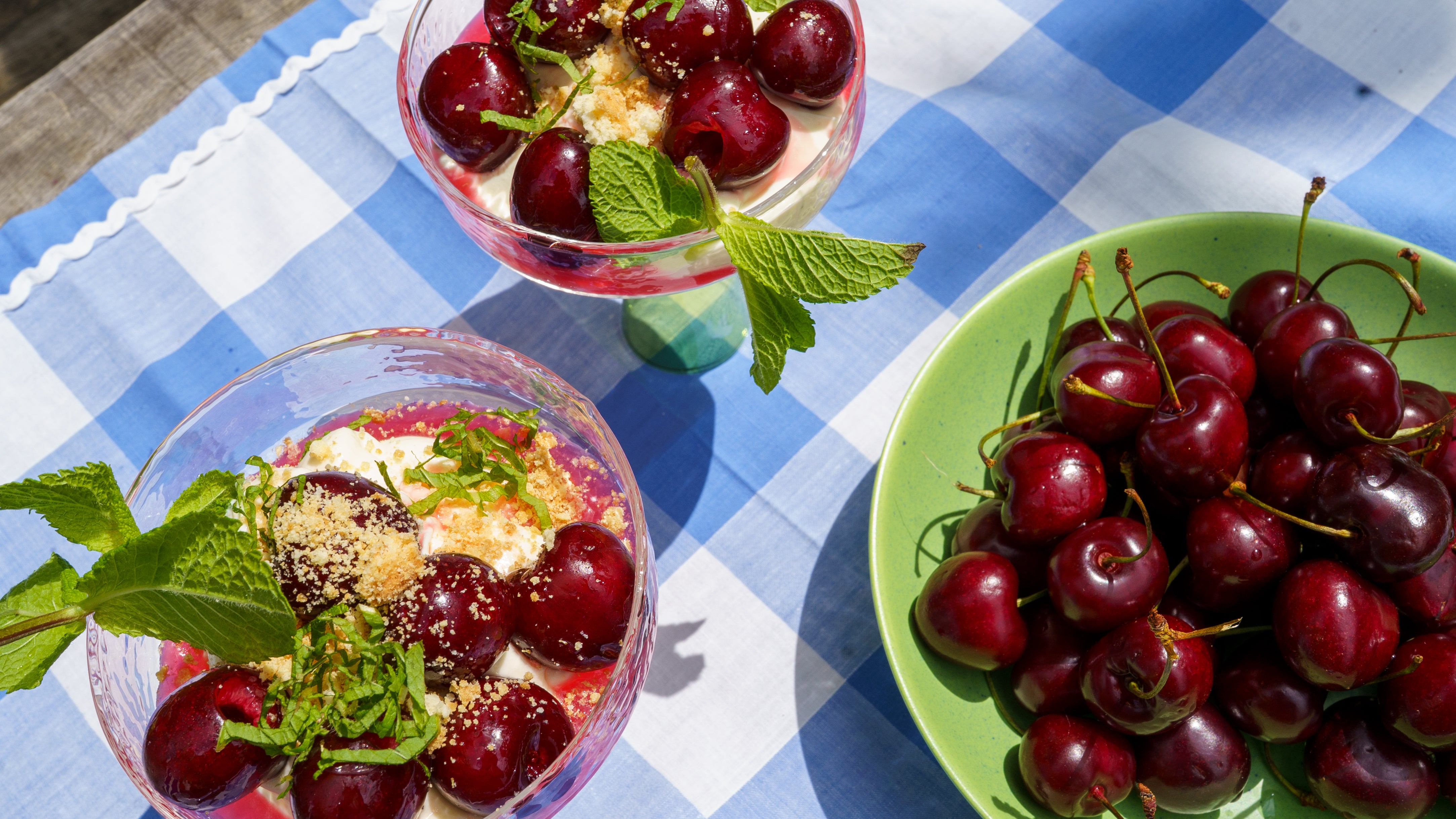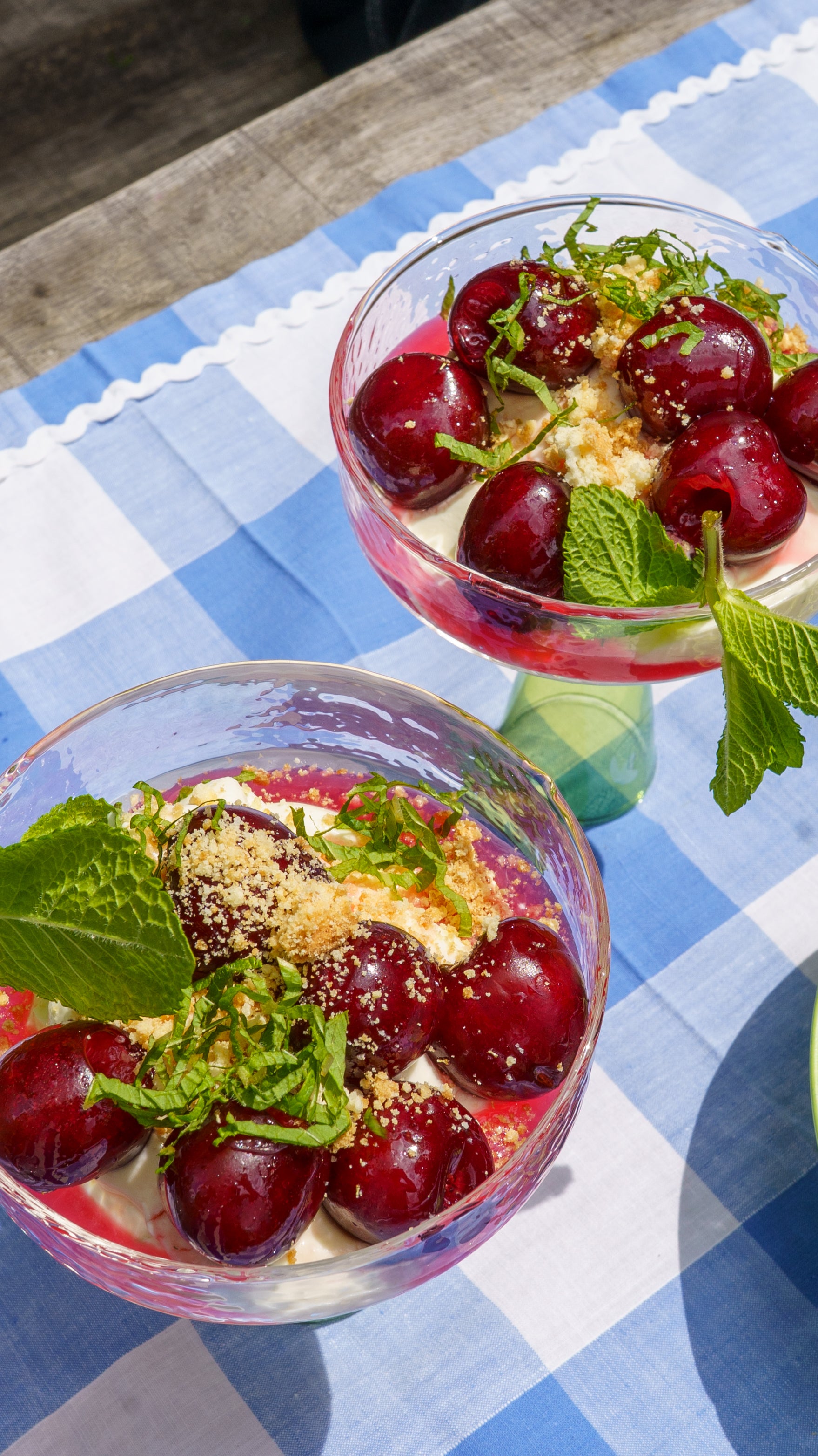 Tiramisu d'été avec des cerises, mascarpone, citron vert et amaretti