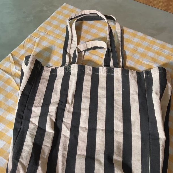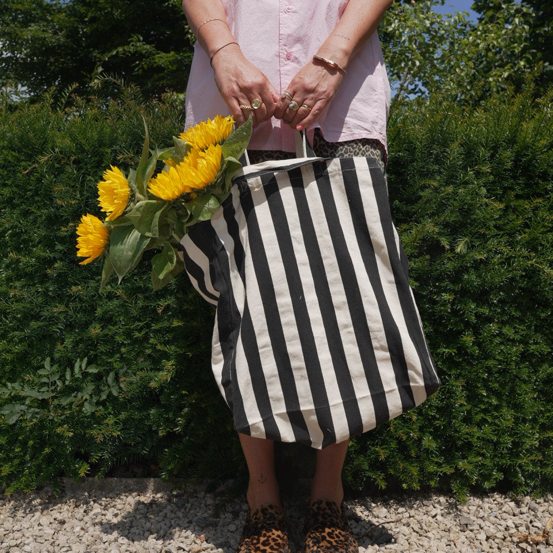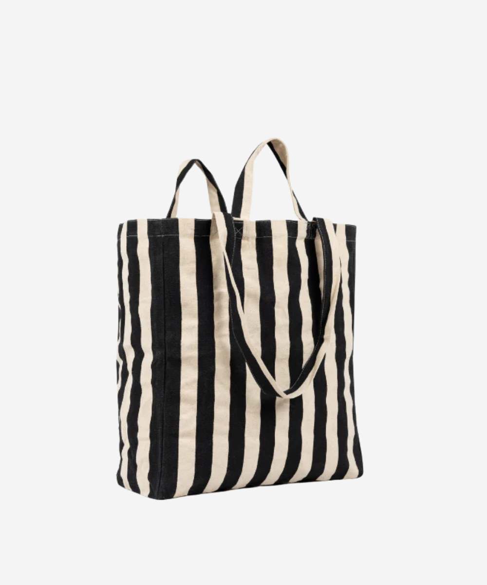 Ce sac durable est fabriqué en coton biologique certifié GOTS et conçu avec le souci de l'homme et de la planète. Le design suédois et le savoir-faire indien se rencontrent dans un sac robuste et plein de caractère. Les rayures sont teintées avec des peintures non toxiques, et tout – de la production à l'emballage – se fait complètement sans plastique.